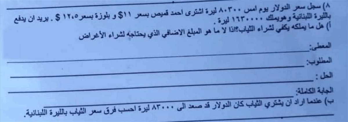 تناقل ناشطون عبر مواقع التواصل الاجتماعي صورة توثق أسئلة عن وضع الدولار في لبنان وذلك خلال امتحانٍ ضمن إحدى المدارس اللبنانية.