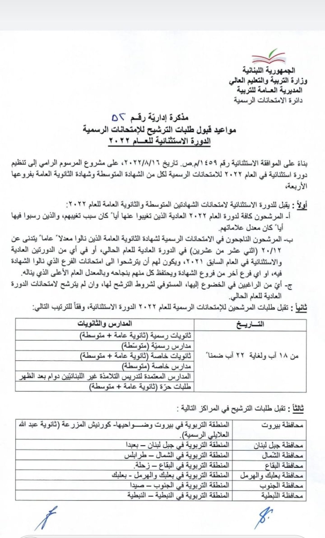 أعلنت وزارة التربية والتعليم العالي عن مواعيد قبول طلبات الترشيح للامتحانات الرسمية للدورة الاستثنائية للعام ٢٠٢٢ للشهادة المتوسطة وشهادة الثانوية العامة بفروعها الأربعة.