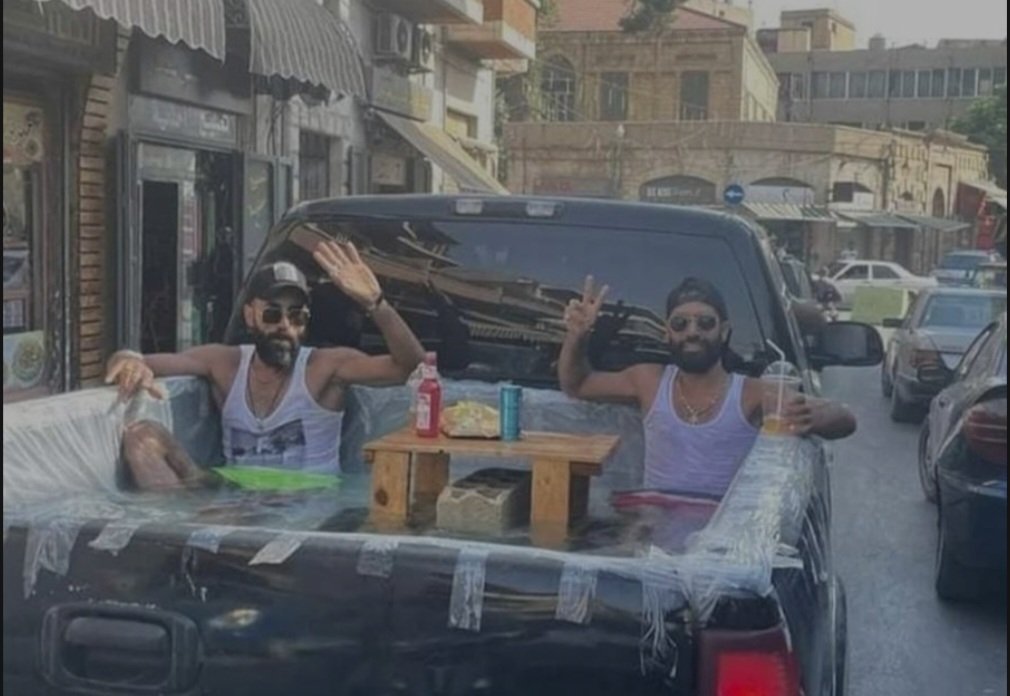 لا ينفكّ اللبناني يحافظ على حسّ فكاهته وجعل مصيبته نكتة ومصدرًا للتفنن والابتداع، مثال على ذلك شابان بعلبكيان يملآن سيارتهما بالماء ويجلسان فيها...