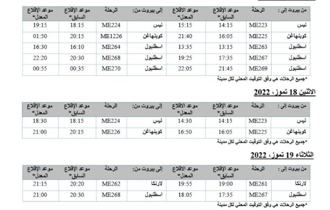 أعلنت شركةُ "طيران الشَّرق الأوسط"- الخطوط الجوِّيَّة اللُّبنانيَّة عن تعديل جزءٍ من جدول رحلاتها للأيَّام التَّالية: 17 و18 و19 تمُّوز 2022 وذلك لأسبابٍ تشغيليَّةٍ...