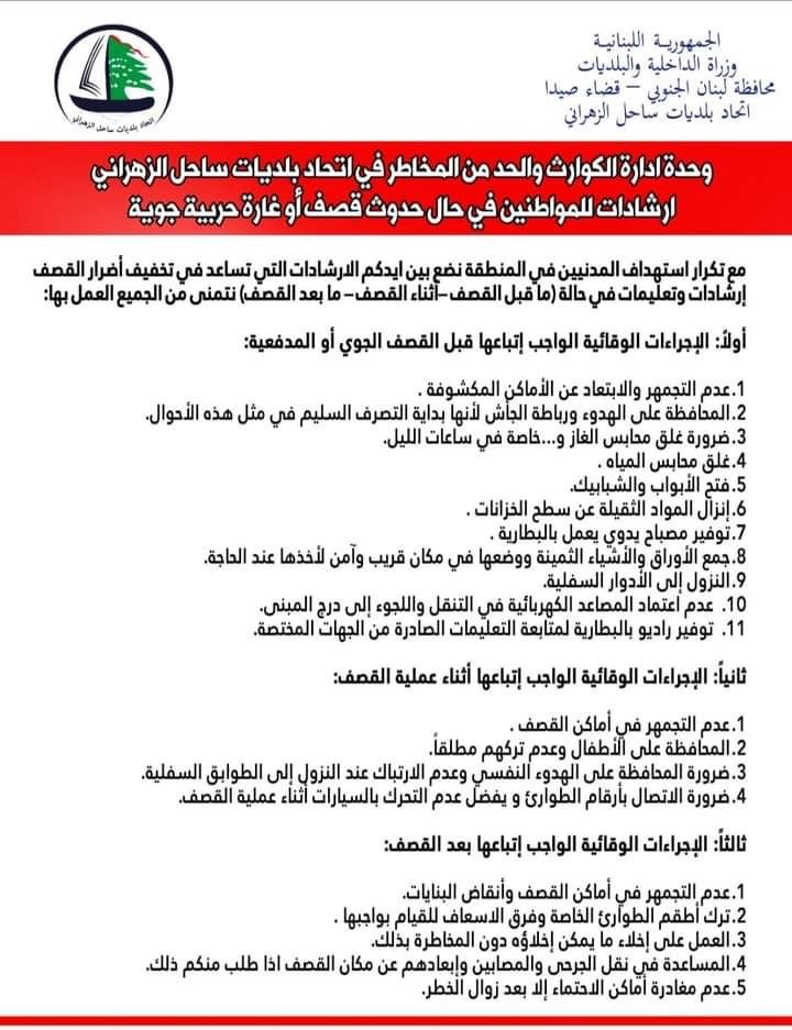 وجه اتحاد بلديات ساحل الزهراني مجموعة من الإرشادات للمواطنين في حال حدوث قصف أو غارة حربية جوية أصدرتها وحدة إدارة الكوارث والحد من المخاطر.