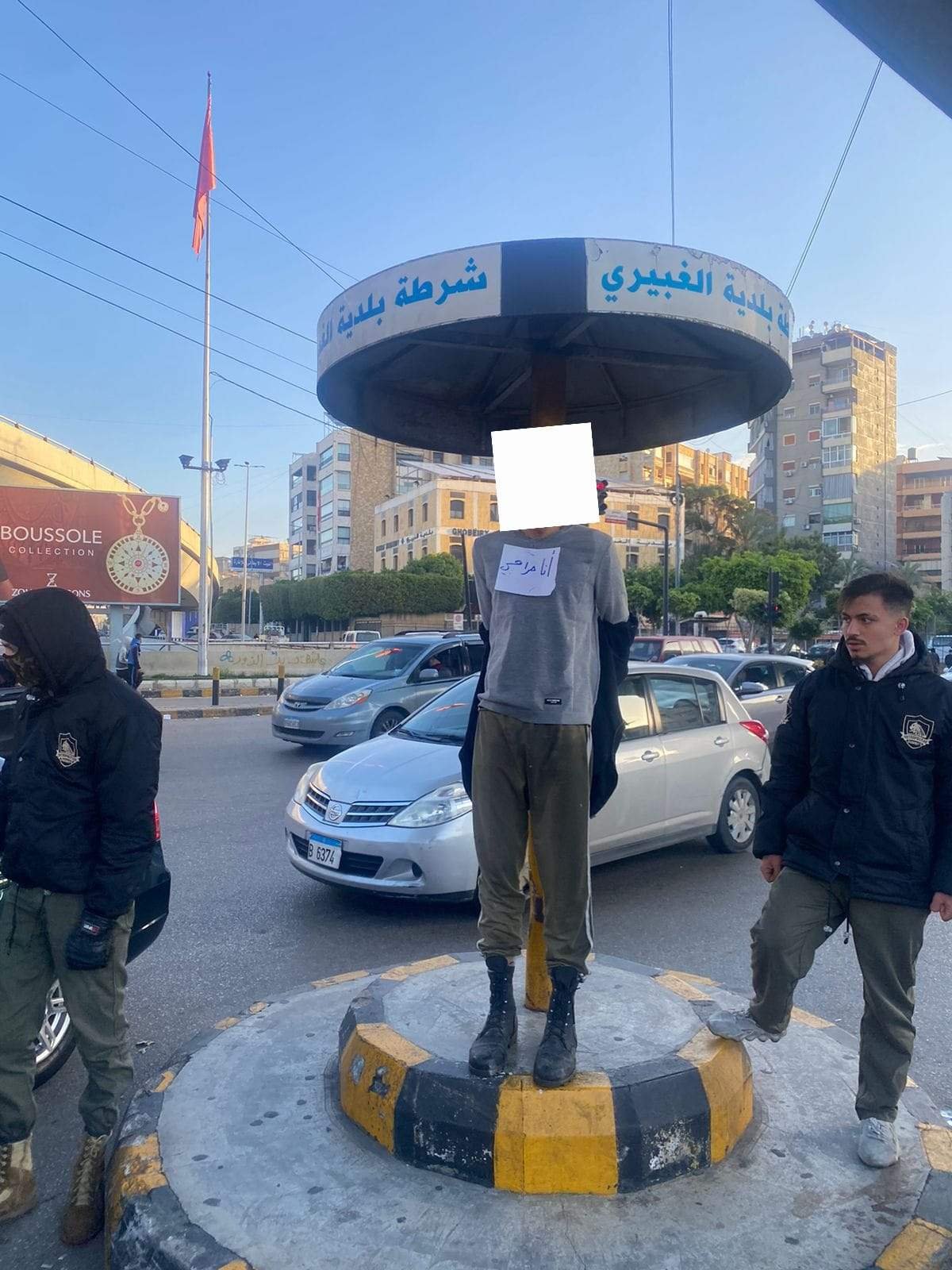 أشارت بلدية الغبيري إلى أنه "يتم تداول شريط فيديو على وسائل التواصل الاجتماعي لشابين أحدهما ملثم وهما يقومان بتقييد شاب على عامود خيمة وسط الطريق اسفل جسر المطار بحجة أنه "حرامي".