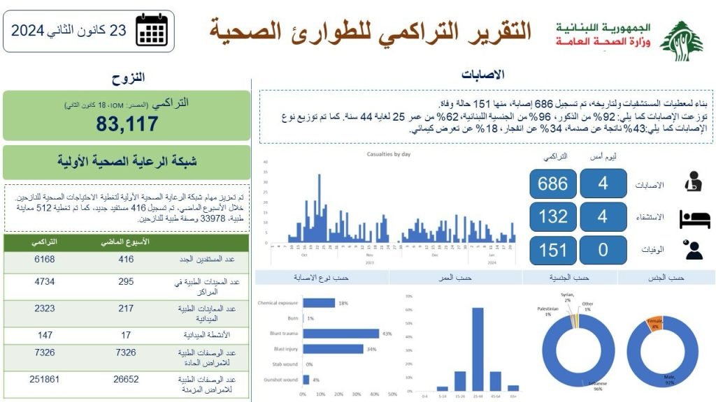 نشرت وزارة الصحة العامة، متابعةً للعدوان الإسرائيلي على جنوب لبنان، التقرير التراكمي للطوارئ الصّحية ل٢٣ كانون الثاني ٢٠٢٤.