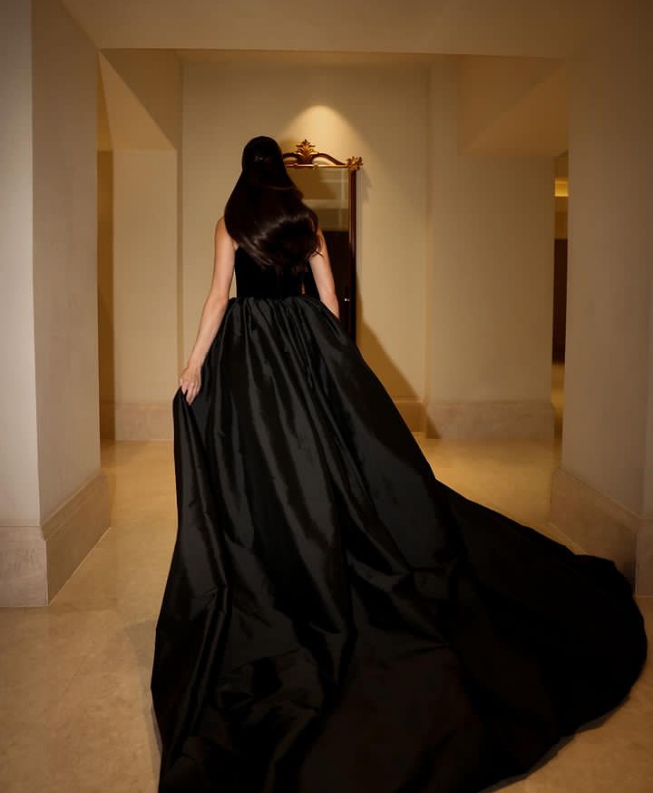 كذلك زيّن الثوب بحبات الكريستال اللمّاعة التي كسرت حدّة الأسود قليلاً.