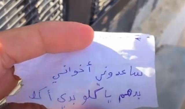 وتضمنت الرسالة التي كُتبت على ورقة ممزقة: "ساعدوني.. إخوتي بدهم ياكلوا بدّي أكل لإخوتي".