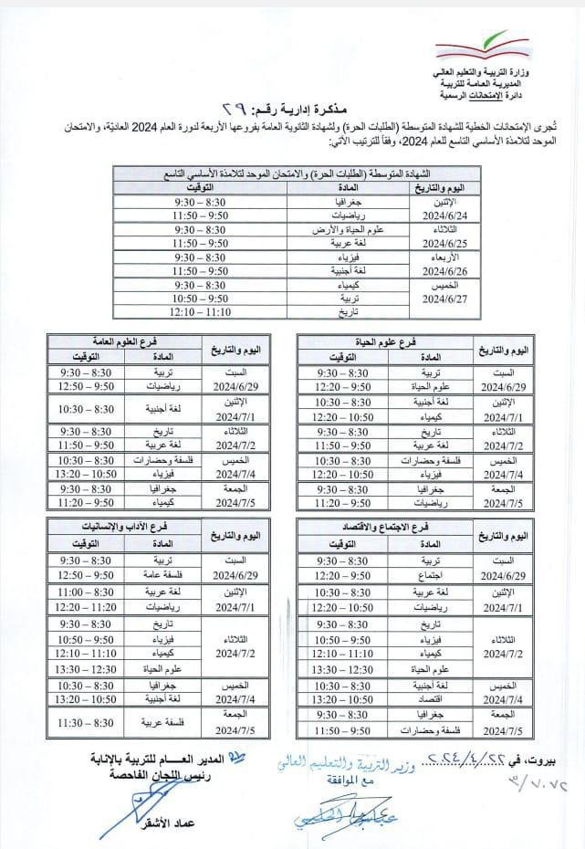 أعلنت وزارة التربيـة والتعليم العالي في مذكرة إداريـة عن موعد إجراء الإمتحانات الخطية للشهادة المتوسطة (الطلبات الحرة) ولشهادة الثانوية العامة بفروعها الأربعة لدورة العام 2024 العاديّة، والامتحان الموحد لتلامذة الأساسي التاسع للعام 2024".