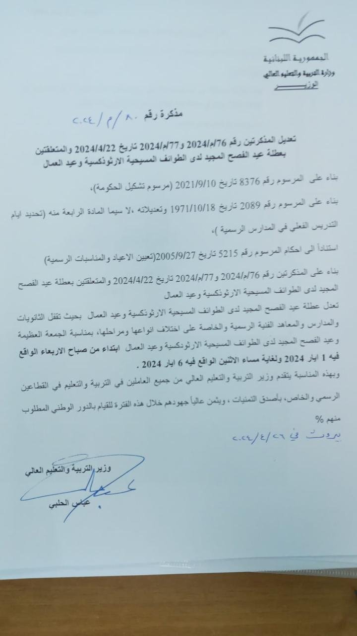 أصدر وزير التربية في حكومة تصريف الأعمال الدكتور عباس الحلبي مذكرة اليوم، عدل بموجبها عطلة عيد الفصح لدى الطوائف المسيحية الأرثوذكسية وعيد العمال، بحيث تقفل الثانويات والمدارس والمعاهد الفنية الرسمية والخاصة على اختلاف أنواعها ومراحلها، بمناسبة الجمعة العظيمة وعيد الفصح المجيد لدى الطوائف المسيحية الأرثوذكسية وعيد العمال، ابتداء من صباح الأربعاء الواقع فيه 1 ايار 2024 ولغاية مساء الإثنين الواقع فيه 6 أيار 2024.