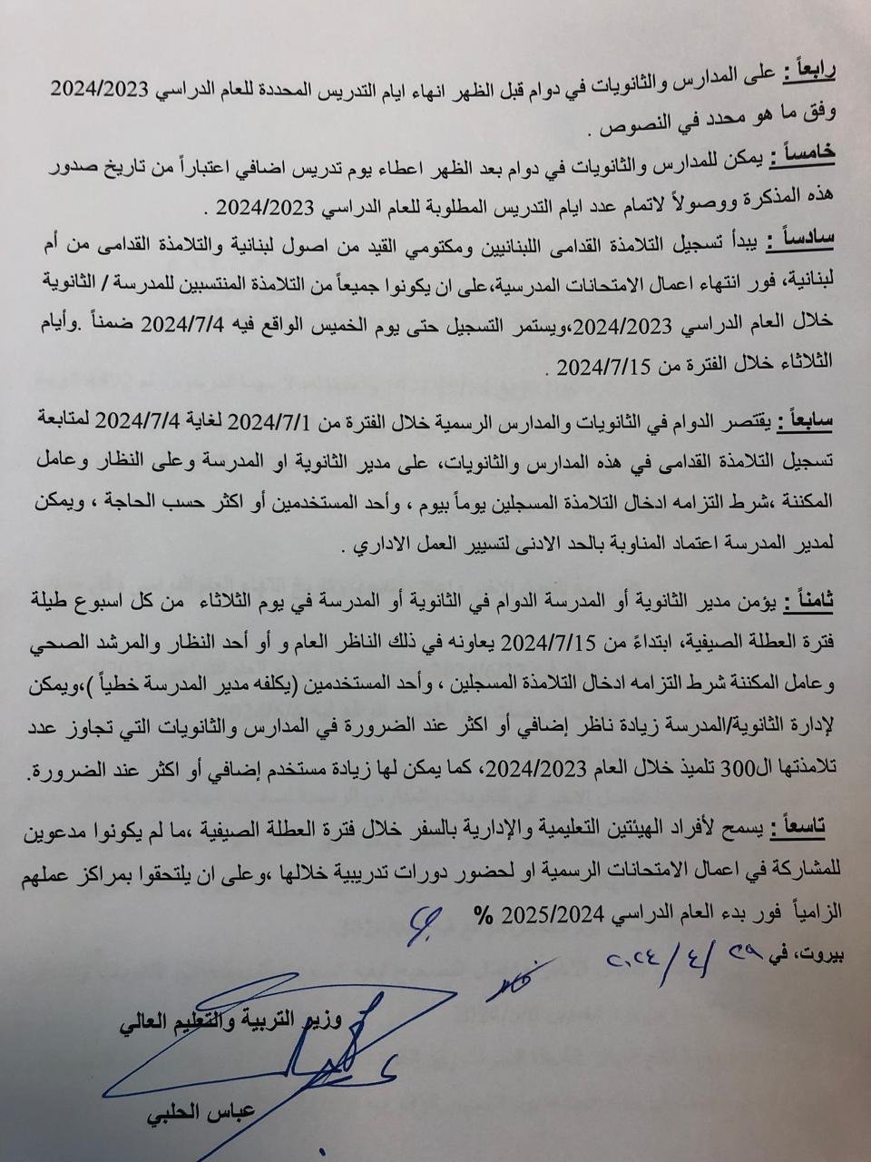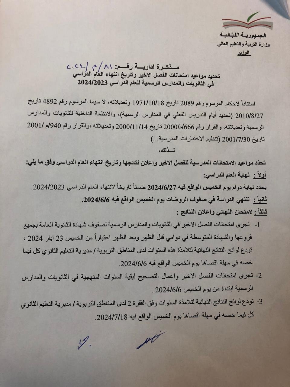 أصدر وزير التربية والتعليم العالي عباس الحلبي قرارًا يقضي بتحديد مواعيد امتحانات الفصل الأخير وتاريخ انتهاء العام الدراسي في الثانويات والمدارس الرسمية للعام ٢٠٢٣-٢٠٢٤.