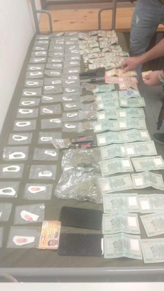 بتفتيشهما والدراجة، ضُبِط بحوزتهما مسدّس حربيّ، وكميّة كبيرة من المواد الممنوعة مُقسّمة ومُعدّة للترويج على الشكل التالي: