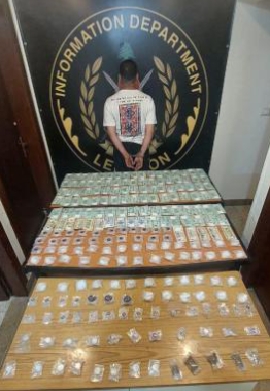 وأضافت، "ضُبِطَت بحوزته، كميّة من المواد المخدّرة المختلفة الأنواع، مقسّمة في أظرف وعلب و"طبّات" بلاستيكيّة، معدّة للتّرويج".