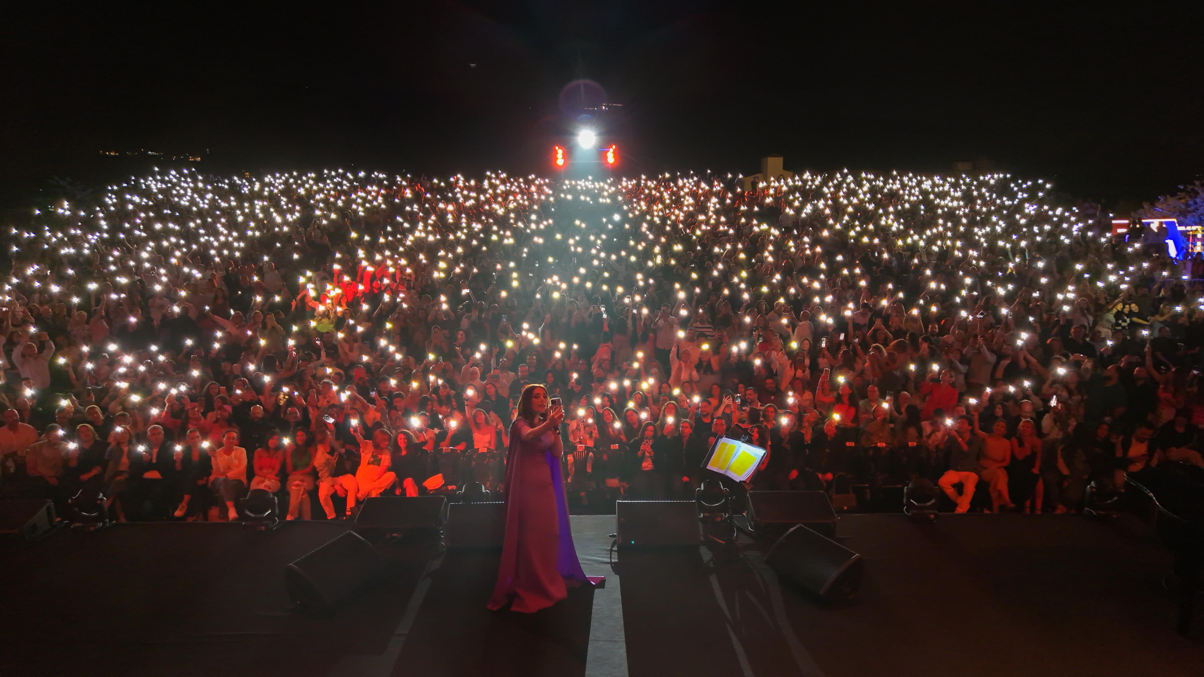 وتحوّل الجمهور الذي فاق الثلاثة آلاف شخص إلى كورس في أغنيات "تلفنتلك، "بيبقى ناس"، و"بلا ما نحس" التي طالبها الجمهور بإعادتها وأضاؤوا هواتفهم وأعربت عن فرحها بهم وصفقوا لها طويلا في الختام مع "حطيت الركوة عالنار".