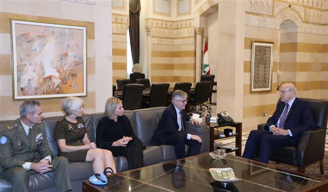استقبل رئيس الحكومة نجيب ميقاتي وكيل الأمين العام للأمم المتحدة لعمليات السلام جان بيار لاكروا على رأس وفد ضم المنسقة الخاصة للأمم المتحدة في لبنان جينين هينيس بلاسخارت وقائد القوات الدولية العاملة في الجنوب"اليونيفيل" الجنرال أرولدو لازارو، في حضور مستشار رئيس الحكومة زياد ميقاتي.