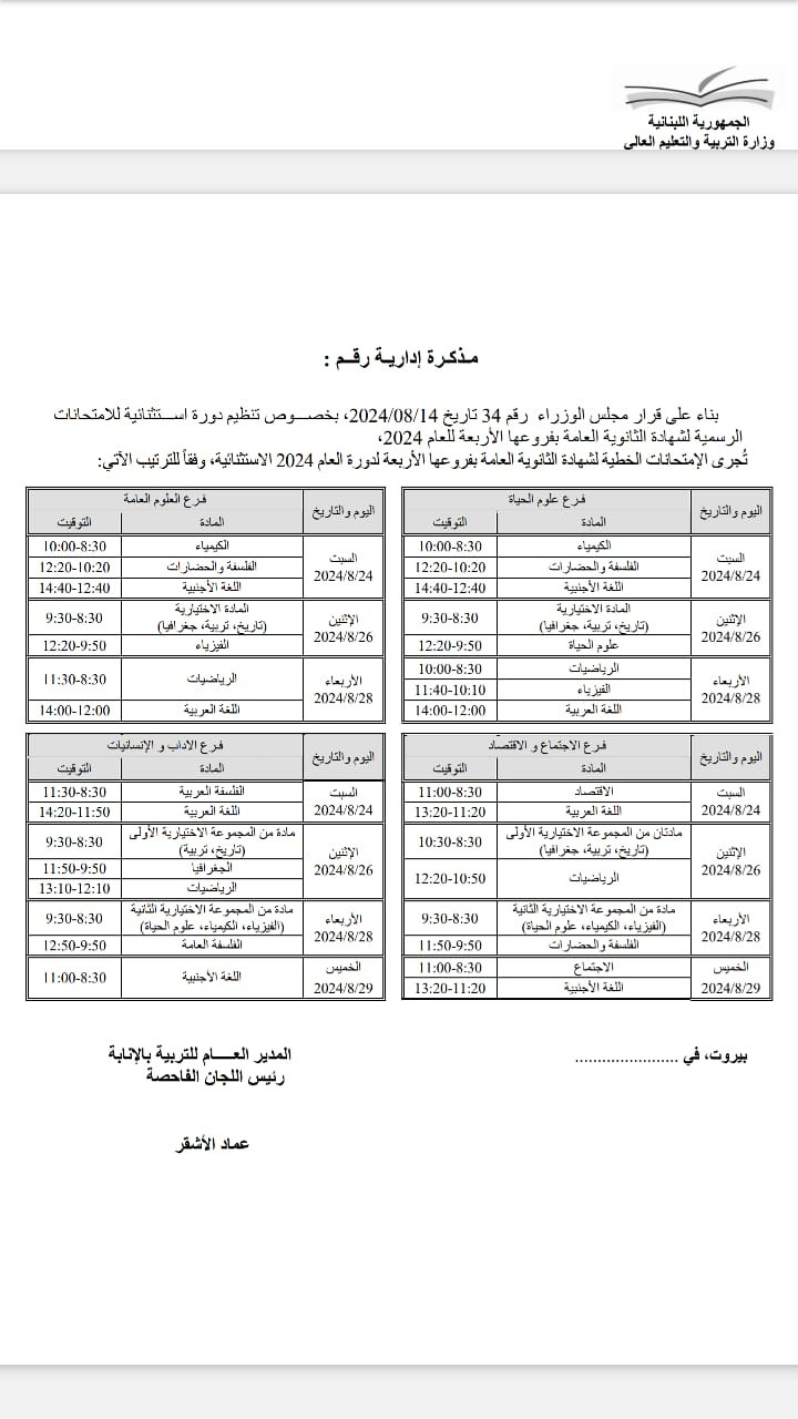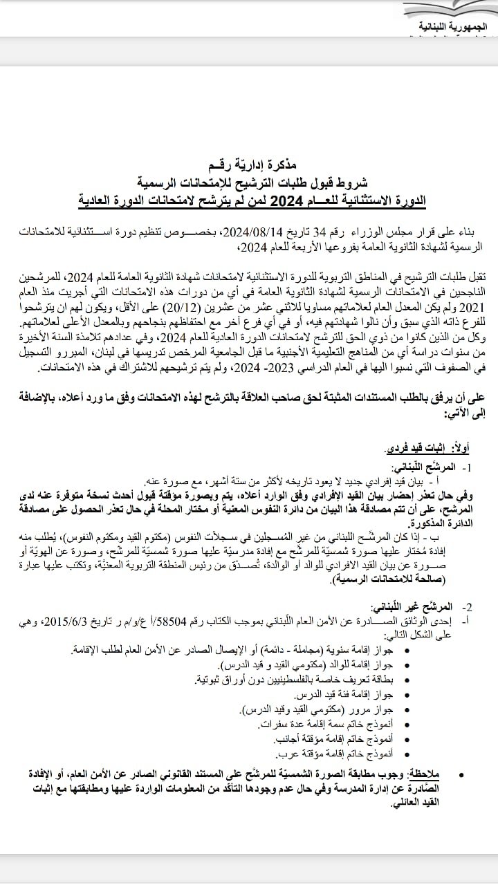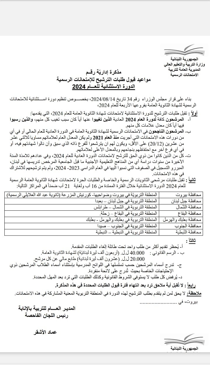 أصدرت وزارة التربية والتعليم مذكرة إداريّة، بشأن مواعيد قبول طلبات الترشيح للامتحانات الرسمية الدورة الاستثنائية للعام 2024.