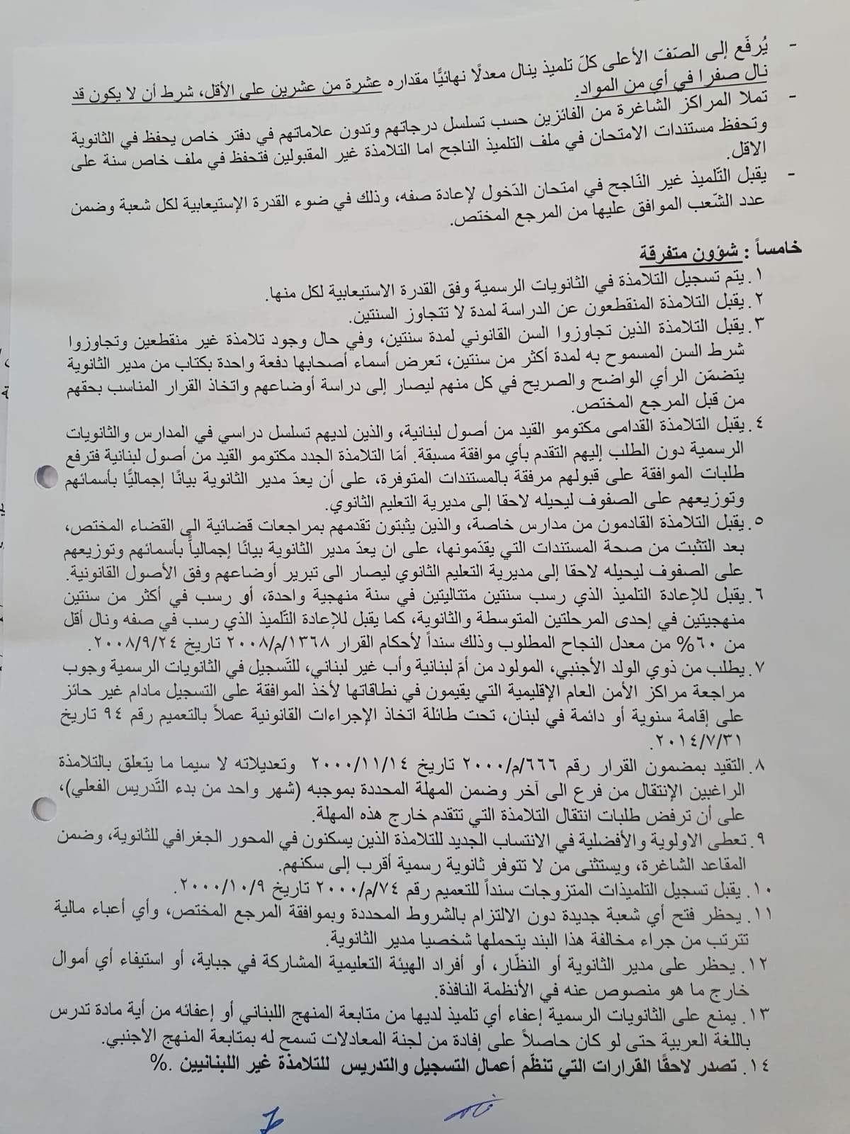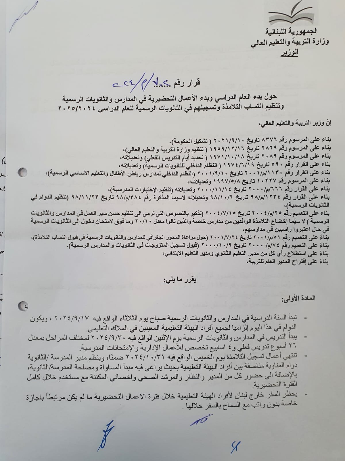 أصدر وزير التربية والتعليم العالي عباس الحلبي قرارًا "حول بدء العام الدراسي وبدء الأعمال التحضيرية في المدارس والثانويات الرسمية وتنظيم انتساب التلامذة وتسجيلهم في الثانويات الرسمية للعام الدراسي ٢٠٢٥/٢٠٢٤".