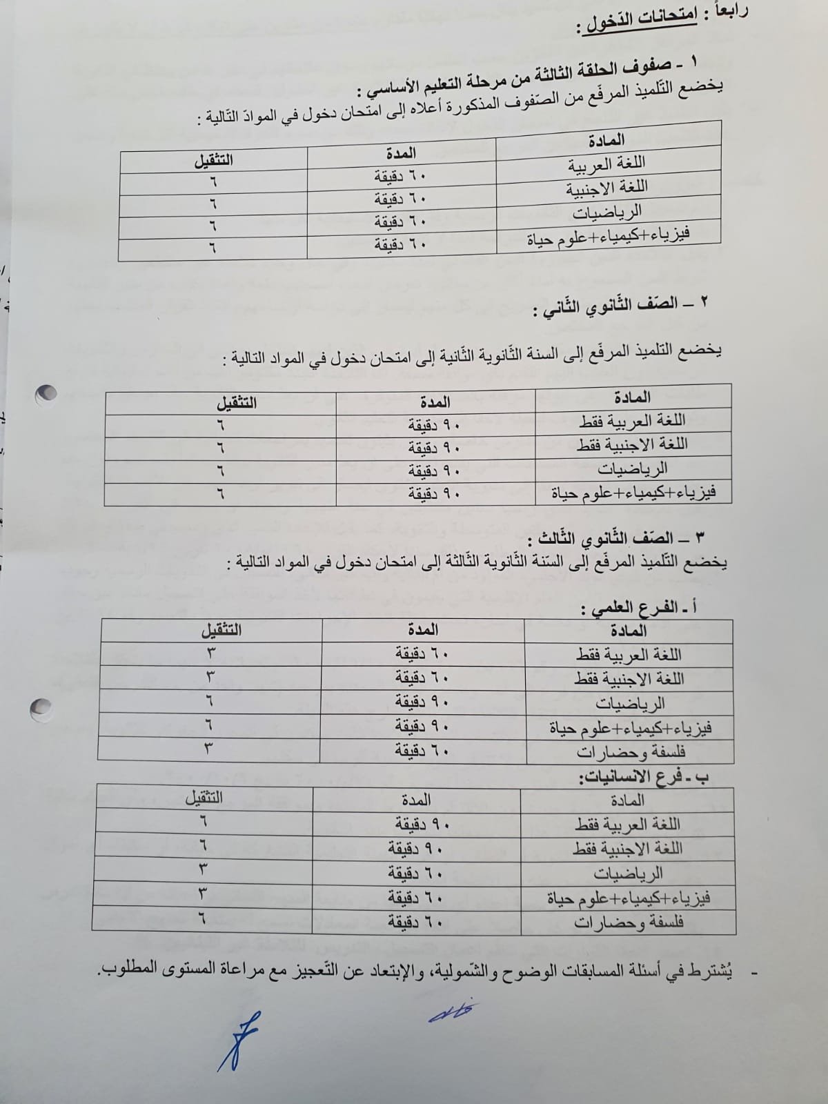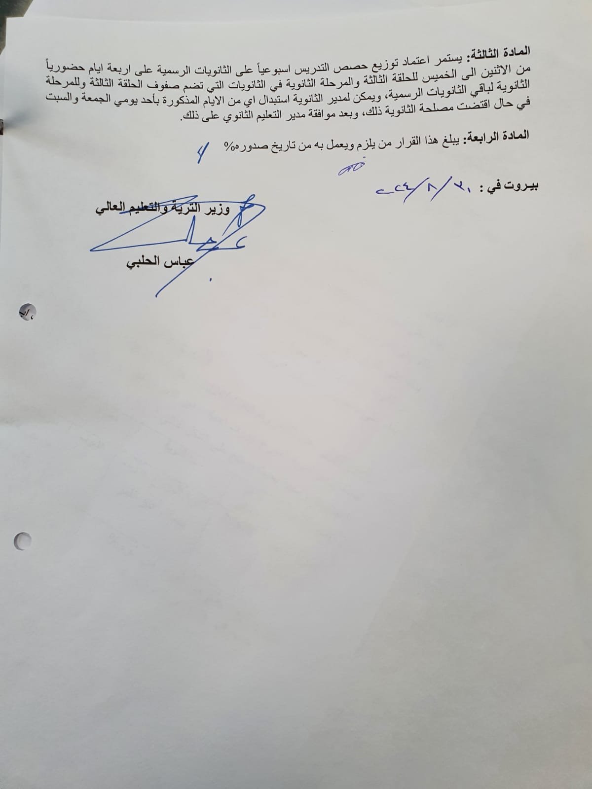 وأوضح أنه "يستمر اعتماد توزيع حصص التدريس أسبوعياً على الثانويات الرسمية على أربعة أيام حضورياً من الاثنين إلى الخميس للحلقة الثالثة والمرحلة الثانوية في الثانويات التي تضم صفوف الحلقة الثالثة وللمرحلة الثانوية لباقي الثانويات الرسمية، ويمكن لمدير الثانوية استبدال أي من الأيام المذكورة بأحد يومي الجمعة والسبت في حال اقتضت مصلحة الثانوية ذلك، وبعد موافقة مدير التعليم الثانوي على ذلك".