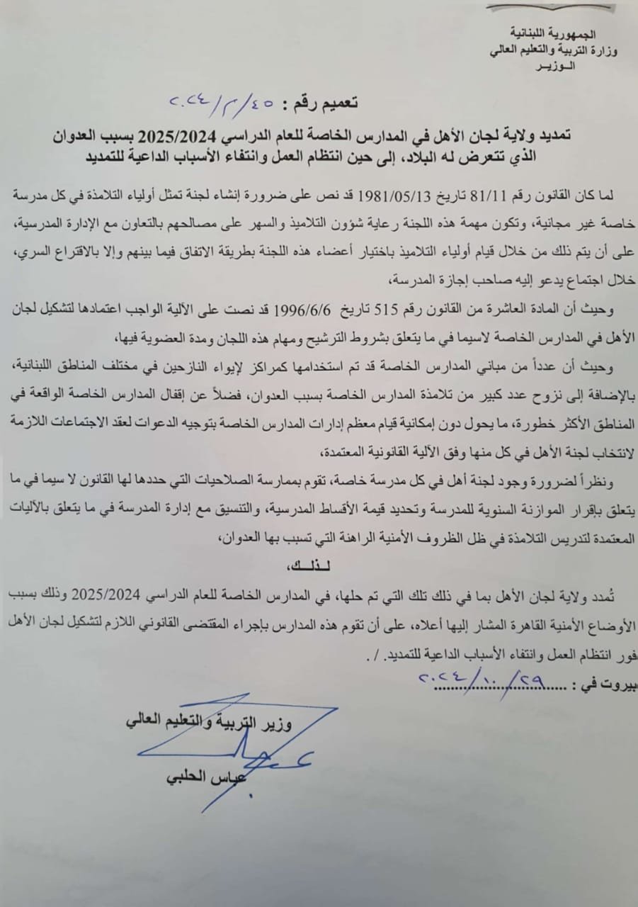 كذلك، أصدرت تعميمًا يتعلق بتمديد ولاية لجان الأهل في المدارس الخاصة للعام الدراسي 2024-2025.