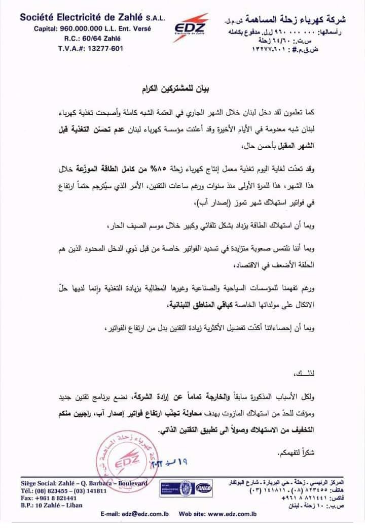 اصدرت شركة كهرباء زحلة اليوم الثلاثاء بيان جاء فية الاتي: