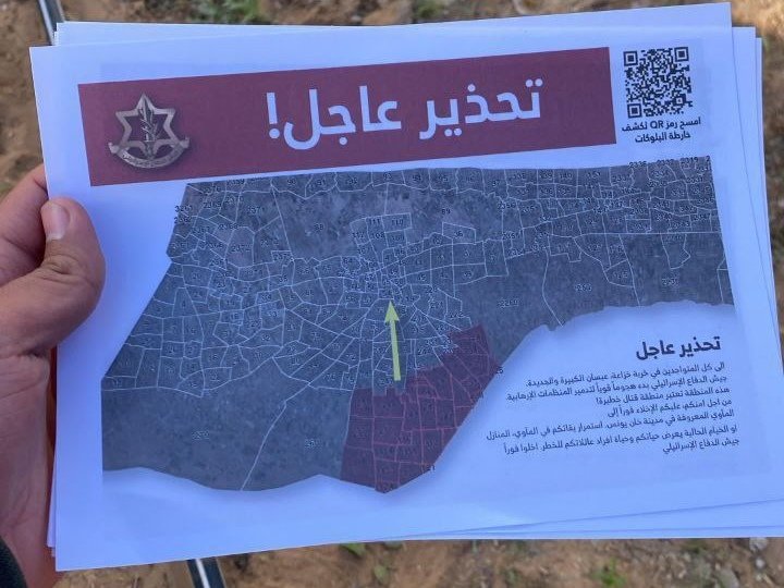 ألقت قوات الاحتلال الإسرائيلي مناشير في سماء خان يونس، دعت فيها سكان بلدات خزاعة وعبسان الكبيرة إلى إخلاء منازلهم وخيامهم، وسط استمرار التصعيد العسكري في القطاع.