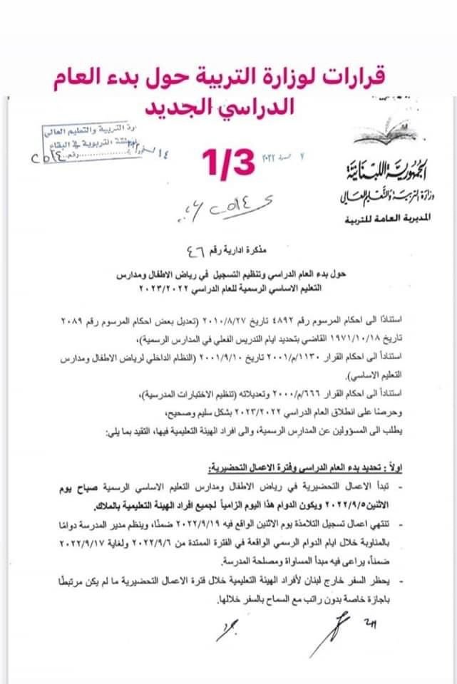 المذكرة الوزارية لوزارة التربية.. هذا ما جاء فيها (بالصور)