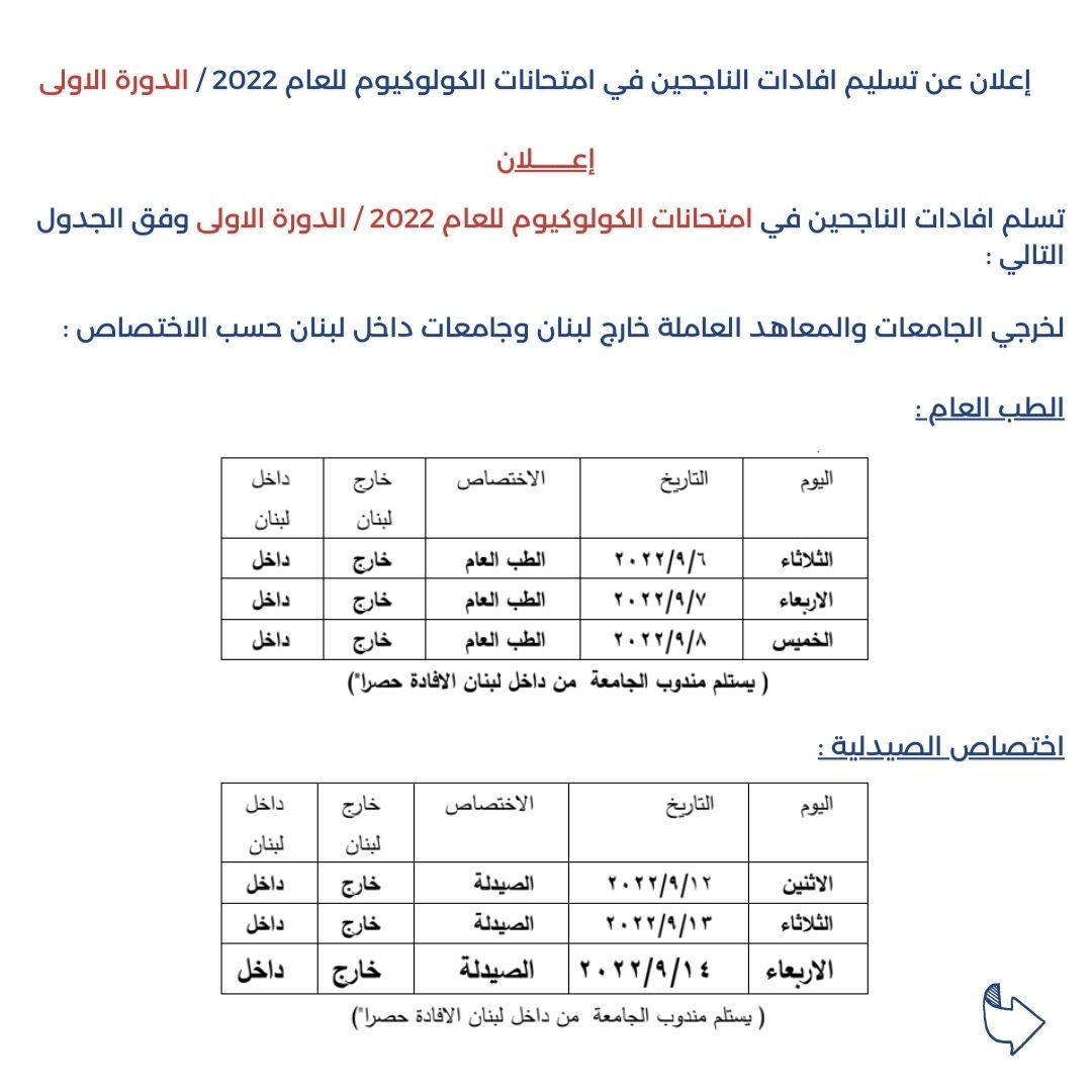 صدر عن وزارة التربية جدول مواعيد تسليم إفادات الناجحين في امتحانات الكولوكيوم للعام 2022 / الدورة الأولى.