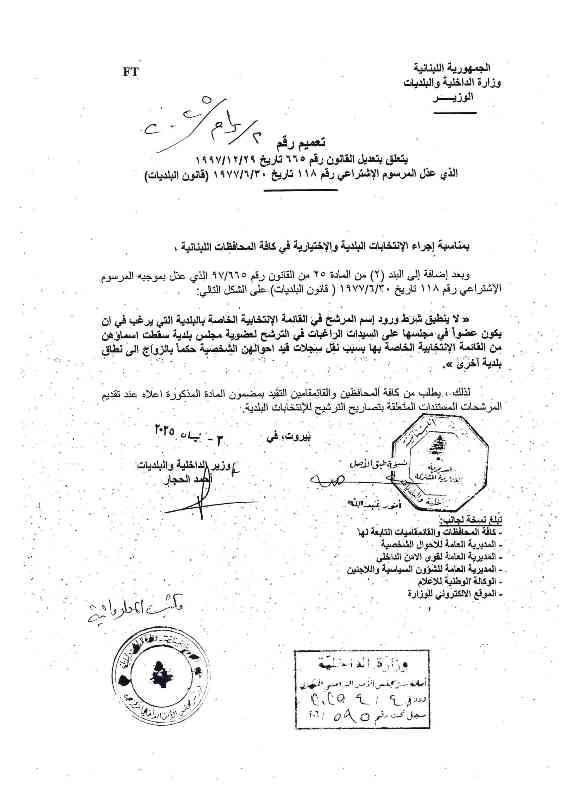 أصدر وزير الداخلية والبلديات أحمد الحجار تعميمًا بشأن ترشيح السيدات لعضوية مجلس البلدية.