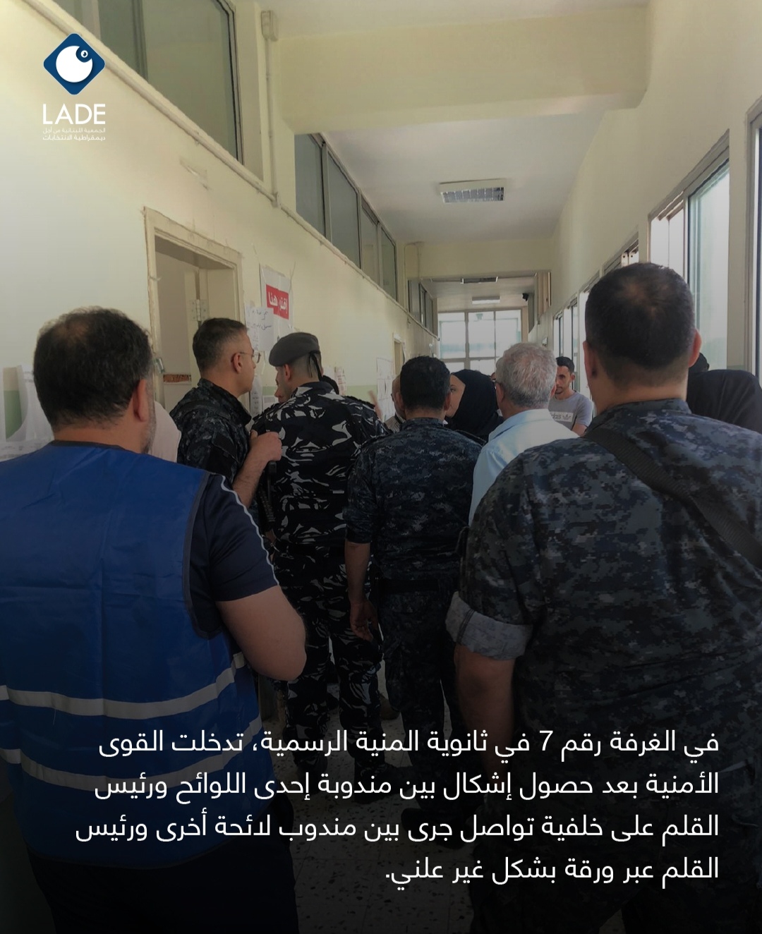 أفادت جمعية "لادي" بتدخّل القوى الأمنية في الغرفة رقم 7 في ثانوية المنية الرسمية، بعد حصول إشكال بين مندوبة إحدى اللوائح ورئيس القلم.