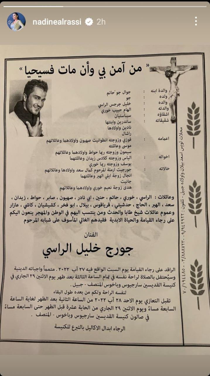 نشرت الفنانة نادين الراسي عبر حسابها الرسمي على انستغرام، ورقة نعوة أخيها الفنان جورج خليل الراسي، والذي توفي اليوم في حادث سير أليم على طريق سوريا – لبنان.