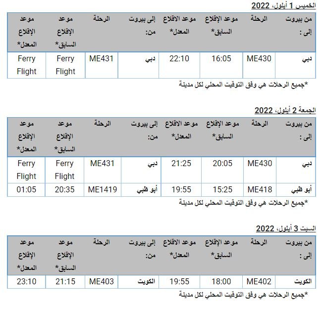 أعلنتْ شركةُ طيران الشرق الاوسط الخطوط الجوية اللبنانية, في بيان، تعديلَ جزءٍ من جدول رحلاتها من 1 إلى 5 أيلول 2022 وذلك لأسبابٍ تشغيليةٍ خارجةٍ عن إرادتها.