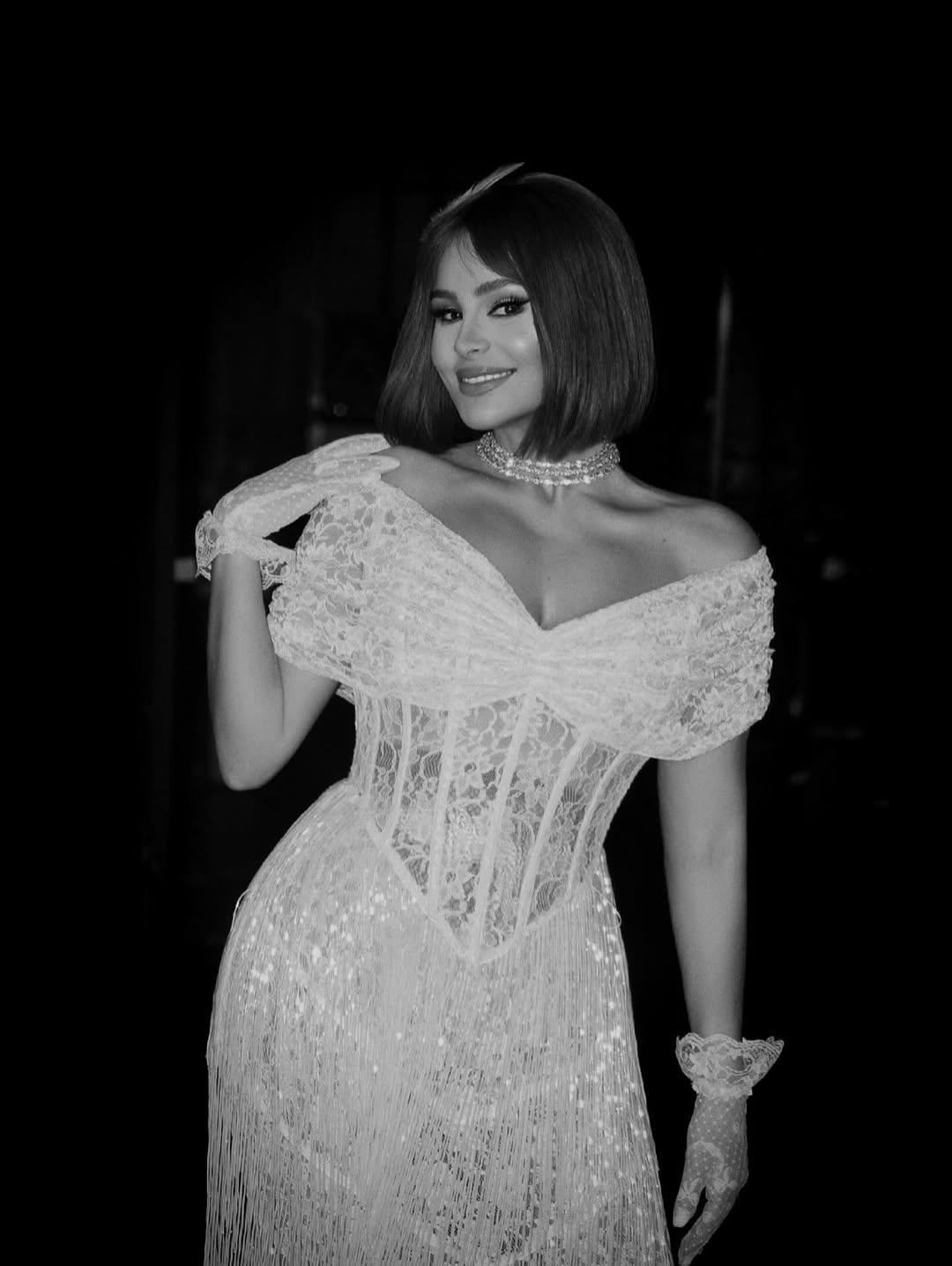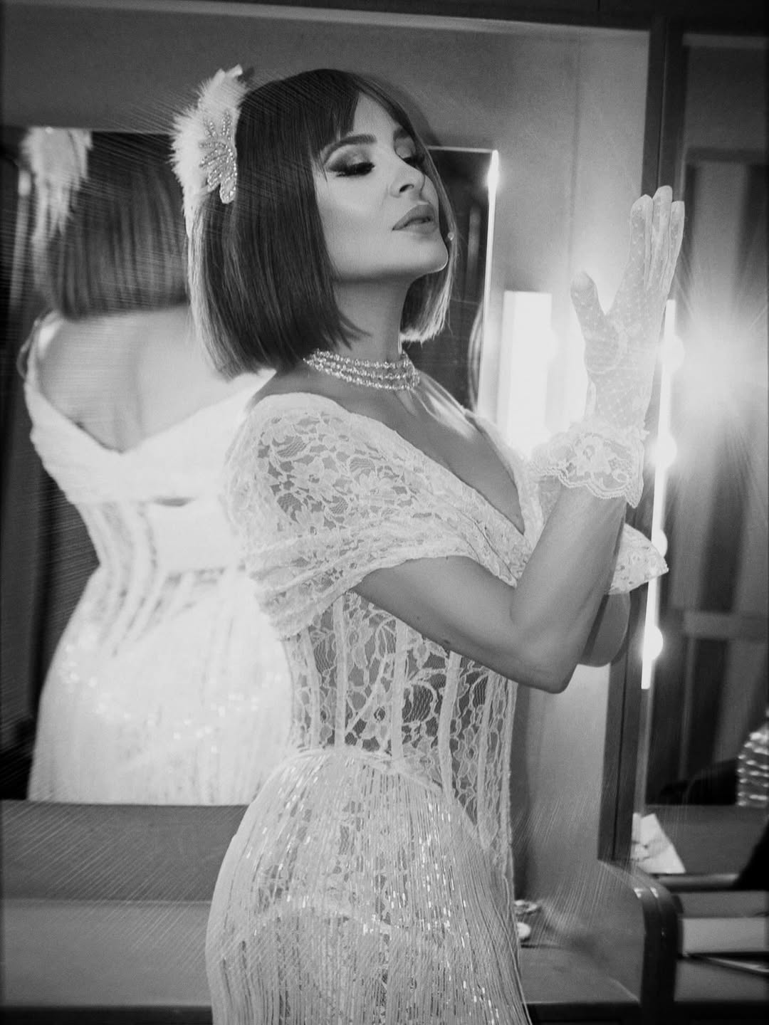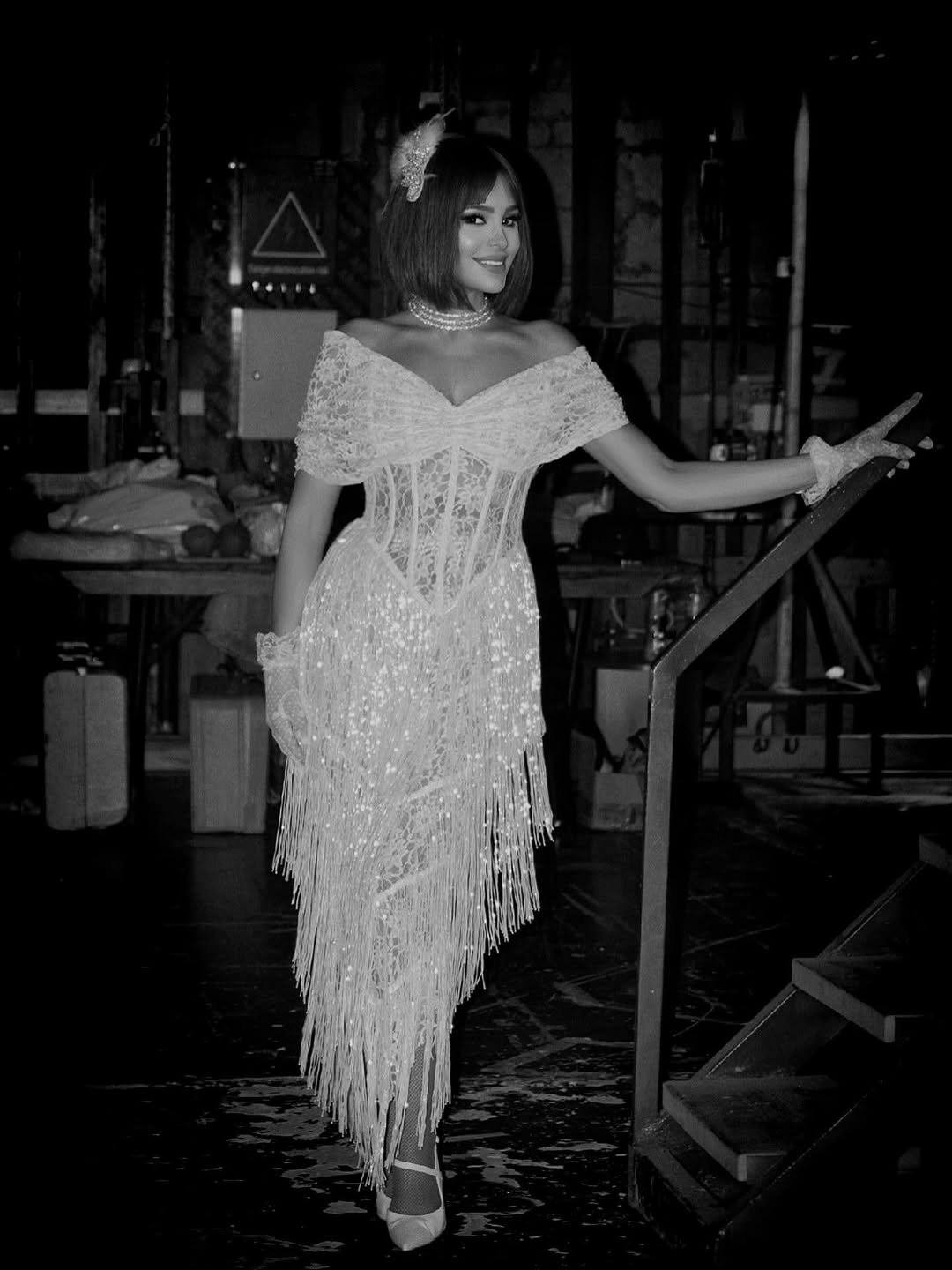 وقد شاركت كارول صورًا من أحد عروض المسرحية، مرتدية فستان دانتيل أبيض مزين بشراشيب لامعة، أضفى عليها لمسة جذابة ومميزة.