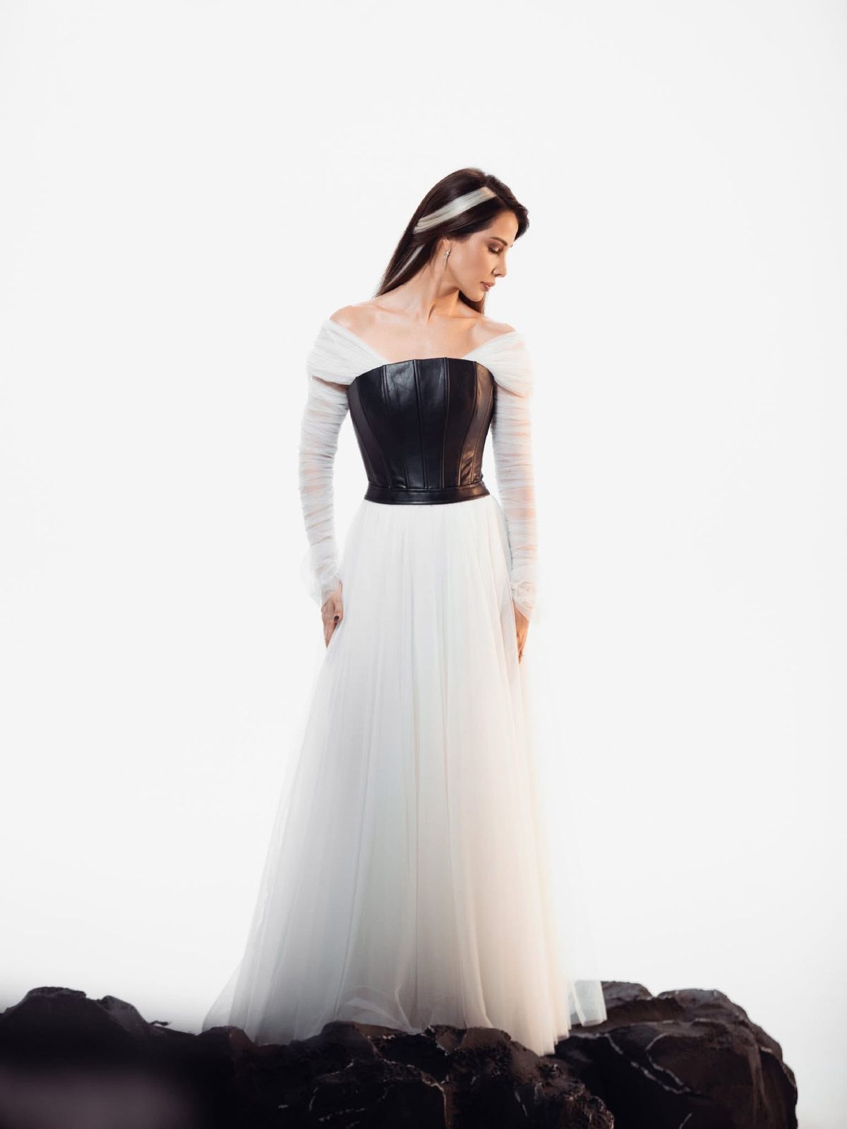 الفستان من تصميم جان لويس صبجي، مصنوع من التول الأبيض بأسلوب انسيابي مع كورسيه من الجلد الأسود أضفى لمسة عصرية، فيما أكملت الإطلالة بمجوهرات Tiffany & Co شملت أقراطًا متدلية وخاتمًا لامعًا.