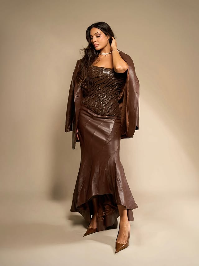 نشرت النجمة اللبنانية نادين نجيم عبر إنستغرام "إطلالة" مونوكروم جلدية أنيقة صمّمت خصيصًا لها من (Lurline Official)، تألّقت فيها بتوب لامع وتنورة طويلة بقصّة ذيل السمكة مع سترة جلدية باللون نفسه، وأكملت الإطلالة بحذاء مدبّب أنيق، ما أضفى مزيدًا من الرقيّ والأسلوب العصري على مظهرها.