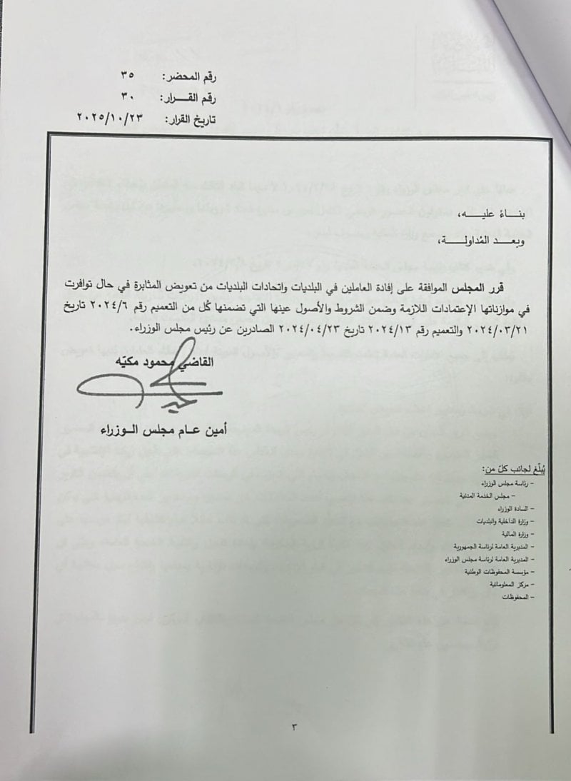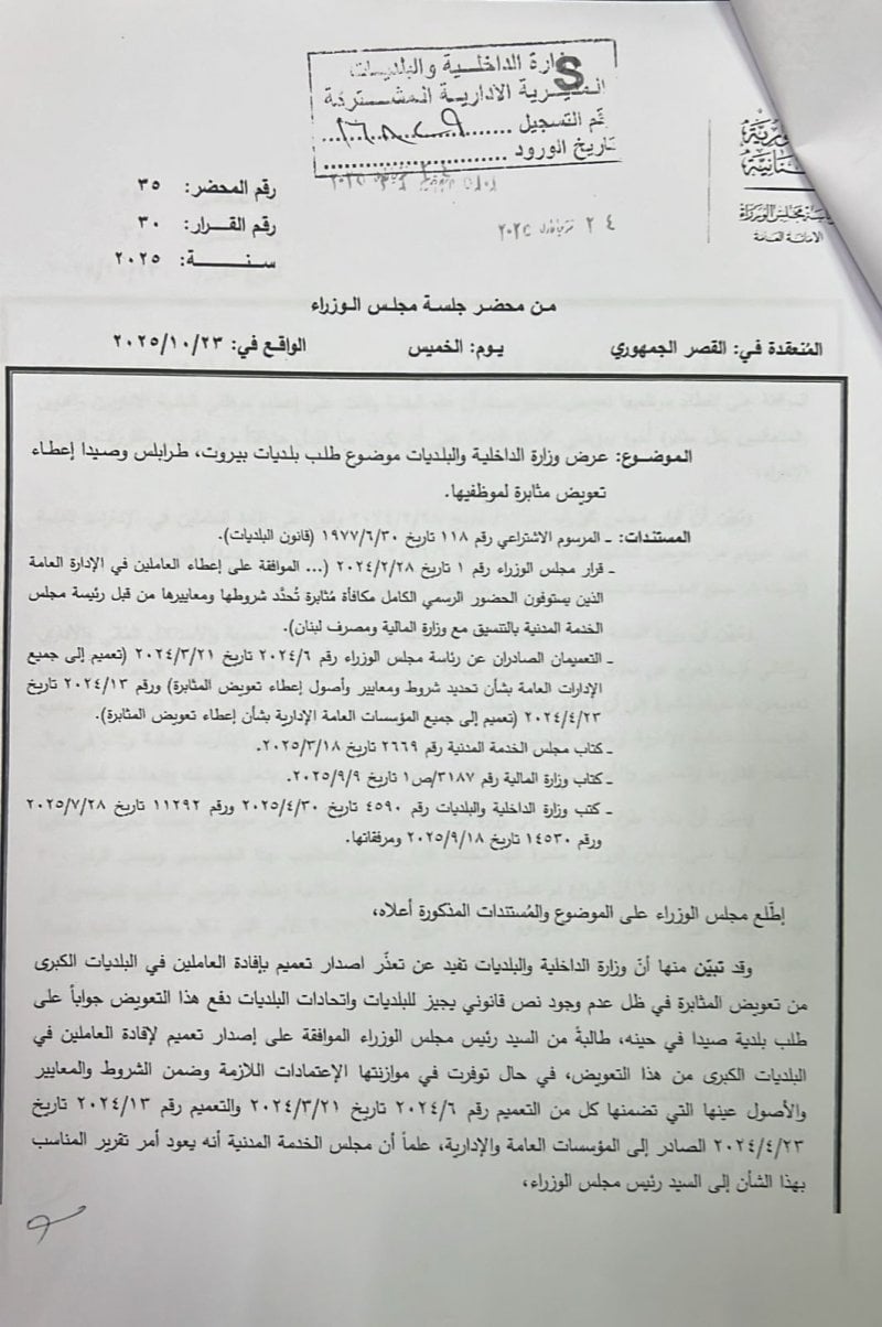 عممت وزارة الداخلية والبلديات قرار مجلس الوزراء رقم 30 تاريخ 23/10/2025، القاضي بالموافقة على إفادة العاملين في البلديات واتحادات البلديات من تعويض المثابرة في حال توافر الاعتمادات اللازمة في موازناتها.