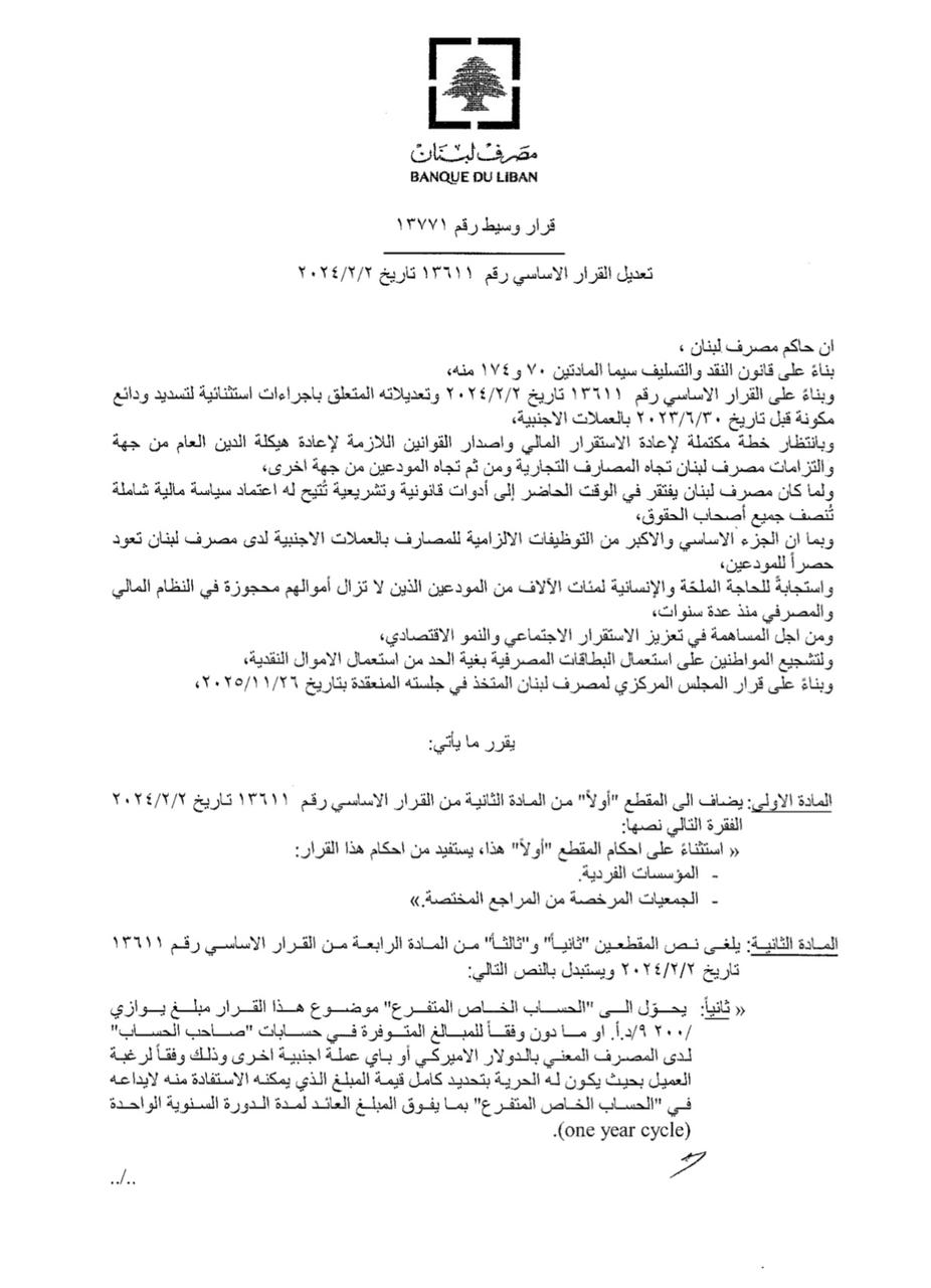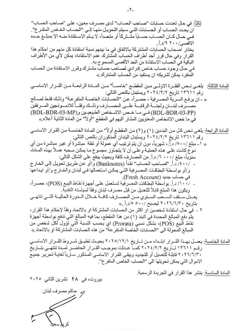 والثاني، يتعلق بتعديل القرار الأساسي رقم 13611 تاريخ 2/2/ 2024 ، يتعلق بإجراءات استثنائية لتسديد ودائع مكونة قبل تاريخ 30 - 6- 2023 بالعملات الأجنبية، المرفق بالتعميم الأساسي رقم 166.