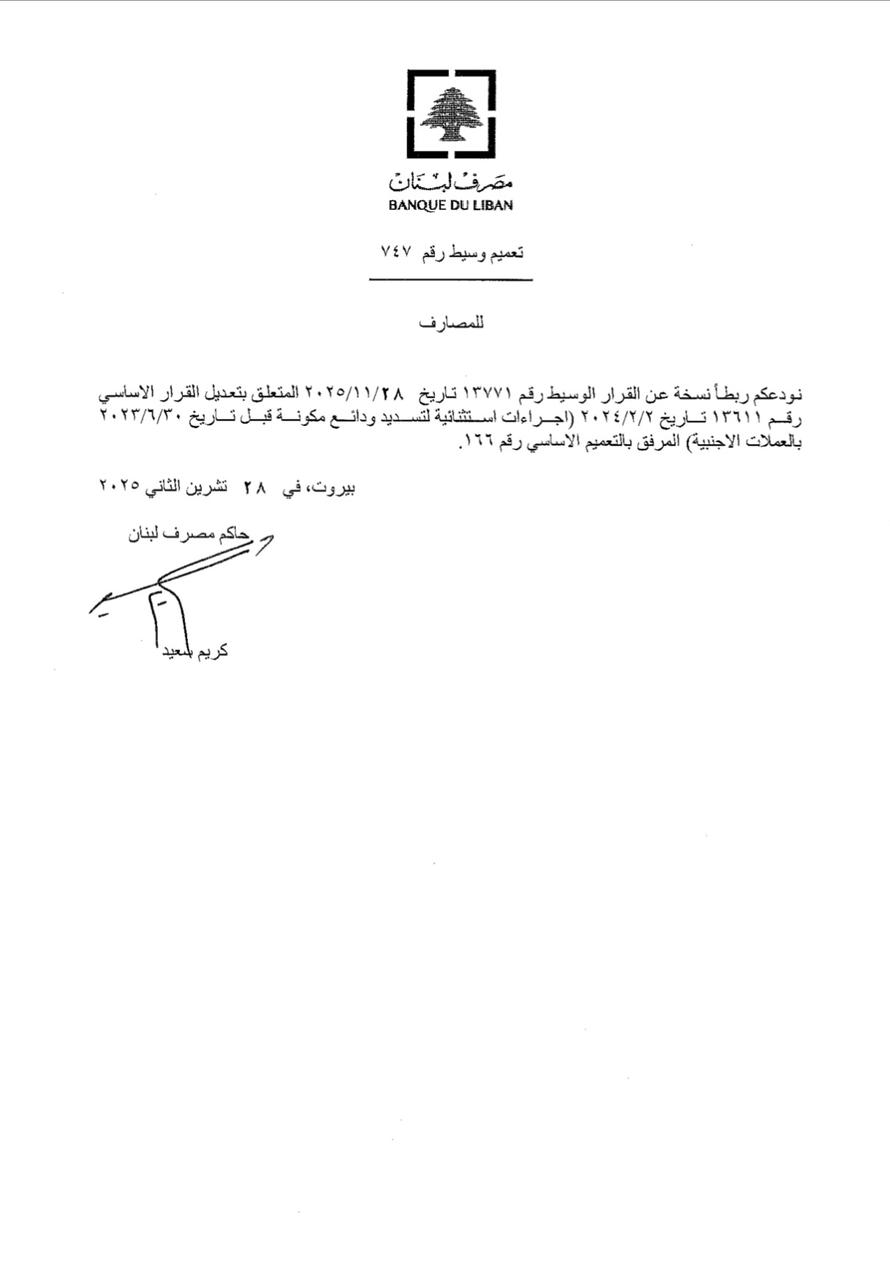 صدر عن مصرف لبنان تعميمان وسيطان موجهان إلى المصارف، وحملا الرقمين 746 و747، الأول يتعلق بتعديل القرار الأساسي رقم 13335 تاريخ 8/6/2021 ( إجراءات استثنائية لتسديد تدريجي لودائع بالعملات الأجنبية".