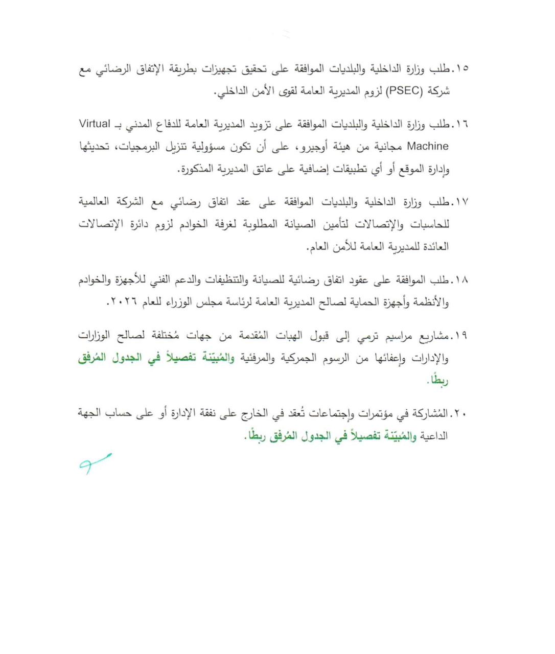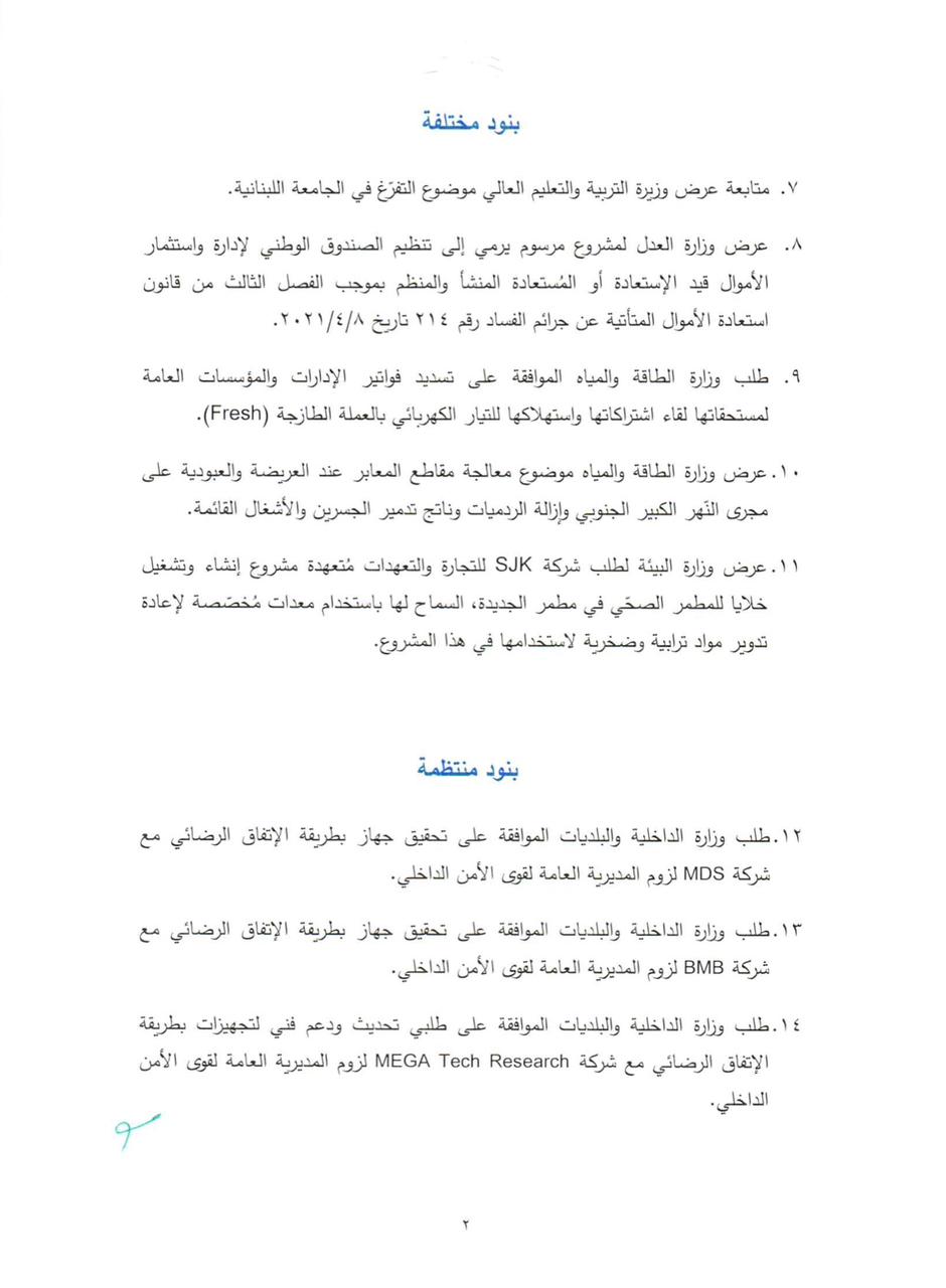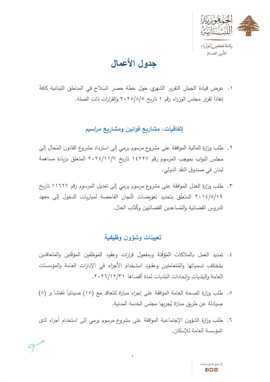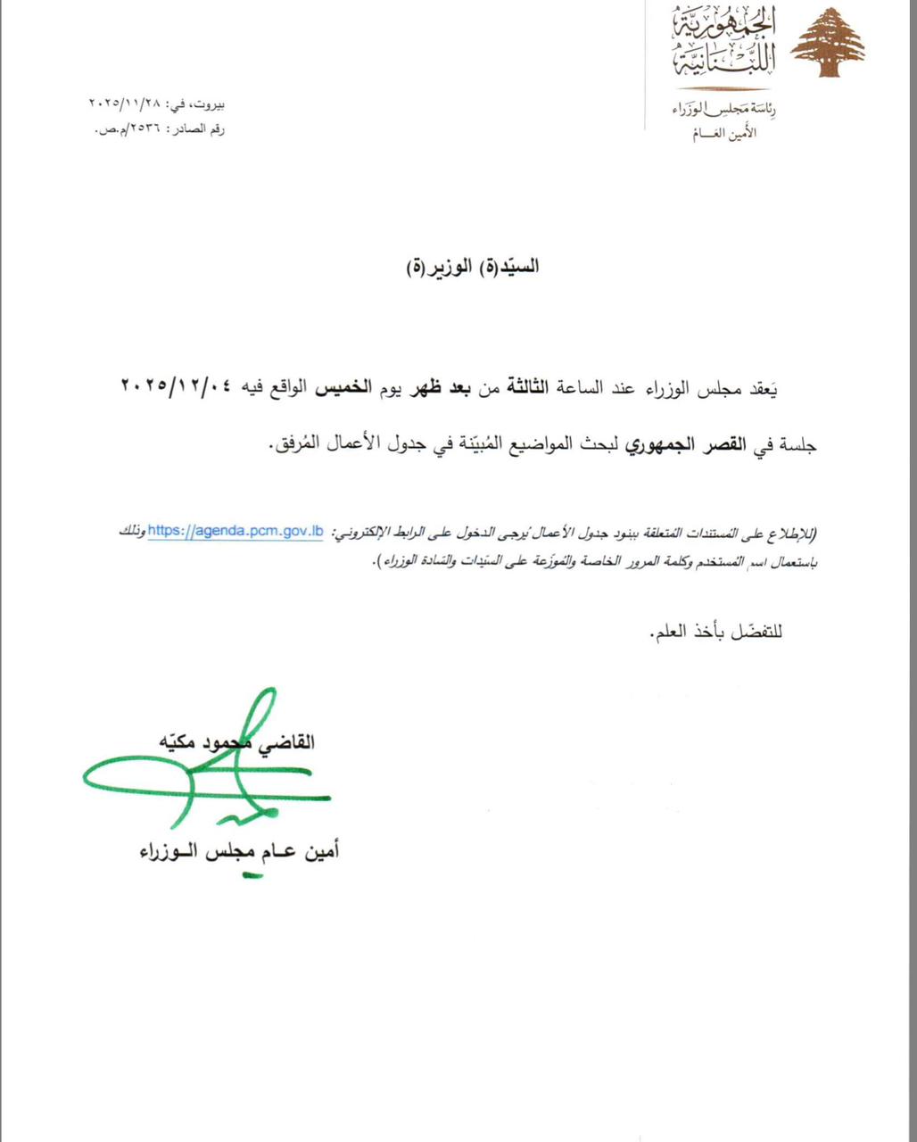 يعقد مجلس الوزراء عند الساعة الثالثة من بعد ظهر يوم الخميس الواقع فيه ٢٠٢٥/١٢/٠٤ جلسة في القصر الجمهوري لبحث المواضيع المبينة في جدول الأعمال المرفق.