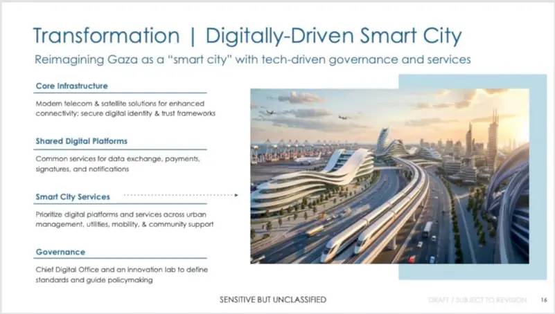 ووفق صحيفة وول ستريت جورنال، أعدّ فريق يقوده جاريد كوشنر، صهر ترامب، إلى جانب مبعوث الشرق الأوسط ستيف ويتكوف، مسودة مقترح من 32 صفحة على شكل عرض باوربوينت، تتضمن تصاميم لناطحات سحاب ساحلية، ورسومات بيانية، وجداول كلفة، وخارطة طريق طويلة الأمد لإعادة الإعمار.