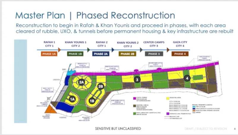 وتعرض الخطة الانتقال من اقتصاد الإغاثة إلى الازدهار، عبر نقل سكان غزة من الخيام إلى مساكن دائمة، من دون تحديد واضح لمصادر التمويل أو أماكن إقامة نحو مليوني نازح خلال فترة البناء. وتحمل الوثيقة تصنيفَ «حسّاس لكن غير سري»، وقد عُرضت على دول مانحة محتملة، بحسب مسؤولين أميركيين.
