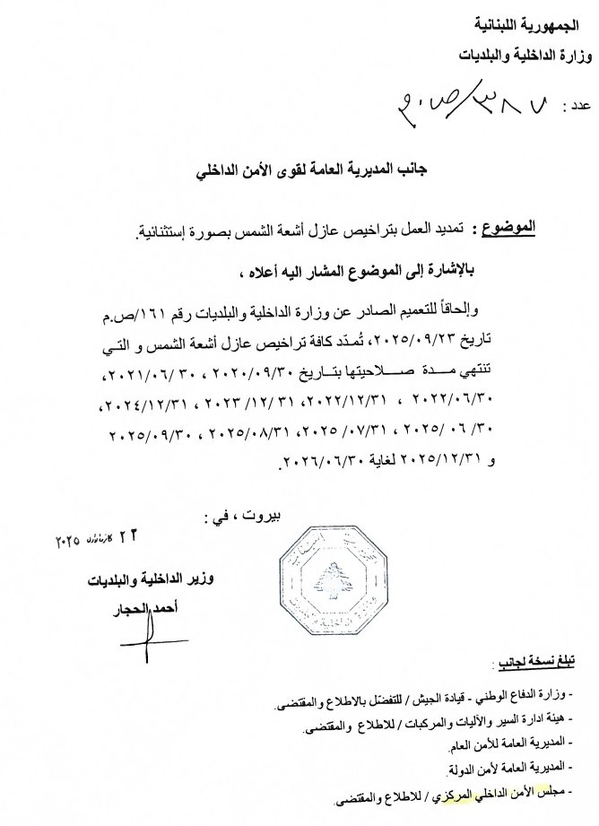 أعلنت وزارة الداخلية والبلديات، عبر حسابها على منصة "إكس"، تمديد العمل بتراخيص عازل أشعة الشمس بصورة استثنائية لغاية 30/06/2026.