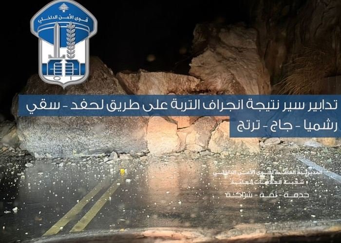 أعلنت المديريّة العامّة لقوى الأمن الداخلي – شعبة العلاقات العامّة، أنّه بتاريخ 13-2-2026، وأدّت غزارة الأمطار إلى انجراف التربة والصخور، ما تسبّب بقطع الطريق العام الذي يربط لحفد – سقي رشميا – جاج – ترتج أمام حركة المرور.