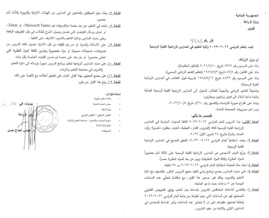 صدر عن وزارة الزراعة بيانٌ جاء فيه: "وقّع وزير الزراعة في حكومة تصريف الأعمال عباس الحاج حسن القرار رقم 484/1 تاريخ 17/10/2022 حدّد فيه بدء العام الدراسي في المدارس الفنية الزراعية كافة اليوم الثلاثاء 24 تشرين الأوّل 2022 وآليات العمل الإداري والتعليمي والفني".