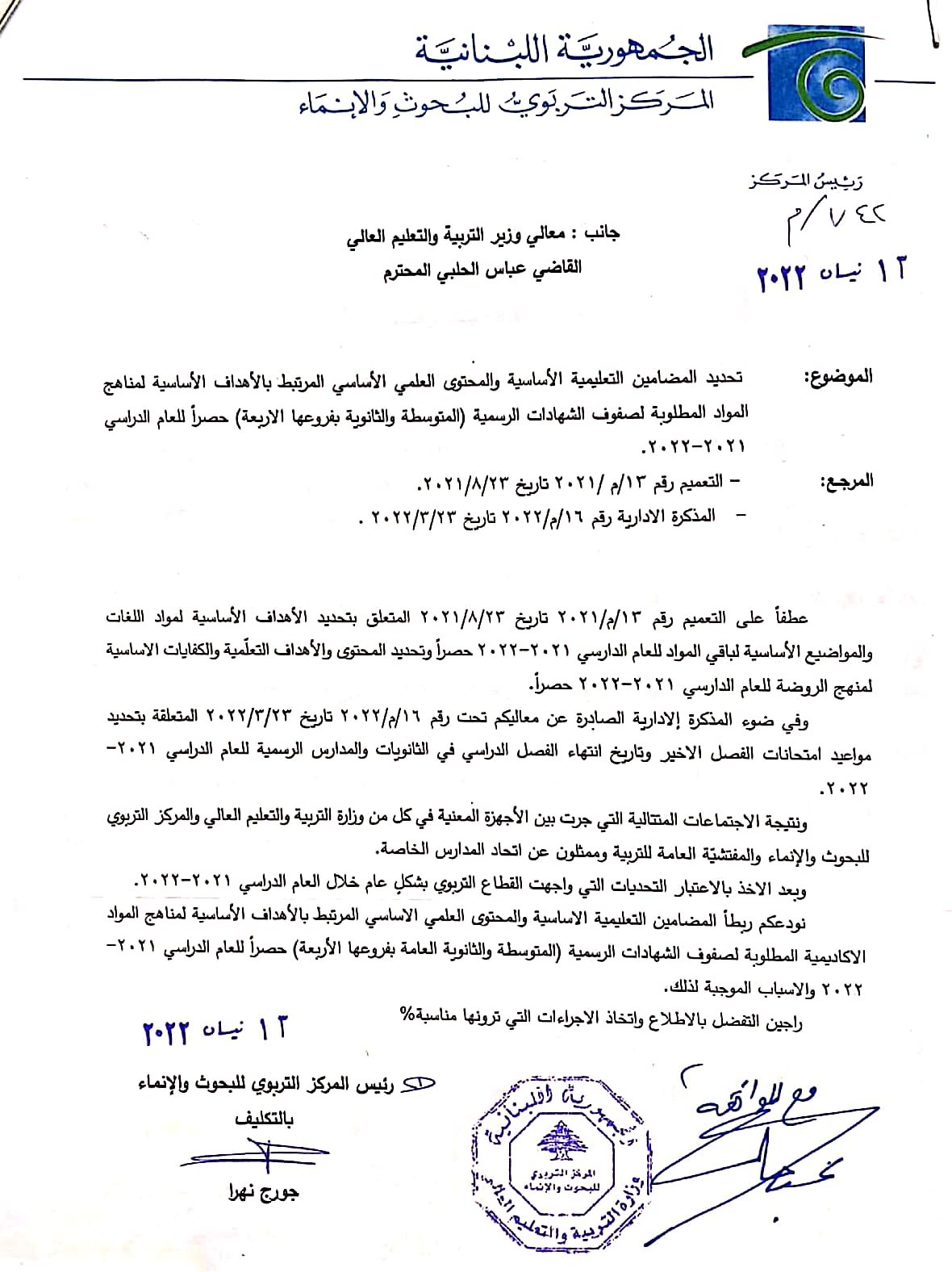أعلن وزير التربية والتعليم العالي الدكتور عباس الحلبي، الأهداف الأساسية المطلوبة لمواد اللغات والمضامين التعليمية الأساسية المطلوبة لمواد العلوم والرياضيات والإجتماعيات وعلم الإقتصاد وعلم الإجتماع والفلسفة والحضارات لإمتحانات الشهادة المتوسطة ولشهادة الثانوية بفروعها الأربعة للعام الدراسي 2021-2022 ، ويمكن لجميع التربويين والمرشحين الاطلاع عليها من خلال الضغط على الرابط الاتي :