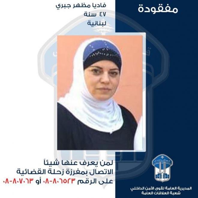 عمِّمت المديريّة العامّة لقوى الأمن الدّاخلي بناءً على إشارة القضاء المختص صورة المفقودة: فاديا مظهر جبري (مواليد عام 1976، لبنانية).