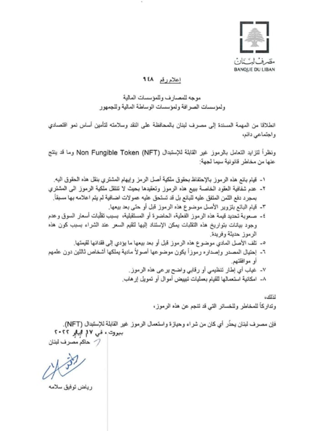 حذّر مصرف لبنان المواطنين من شراء وحيازة واستعمال الرموز غير القابلة للاستبدال (NFT) تداركًاً للمخاطر وللخسائر التي قد تنجم عنها.