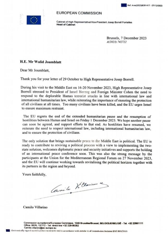 تلقّى الرئيس السابق للحزب "التقدمي الاشتراكي" وليد جنبلاط رسالة جوابية من منسق السياسة الخارجية في الاتحاد الأوروبي جوزيب بوريل، عبر مدير مكتبه كاميلو فيلارينو.