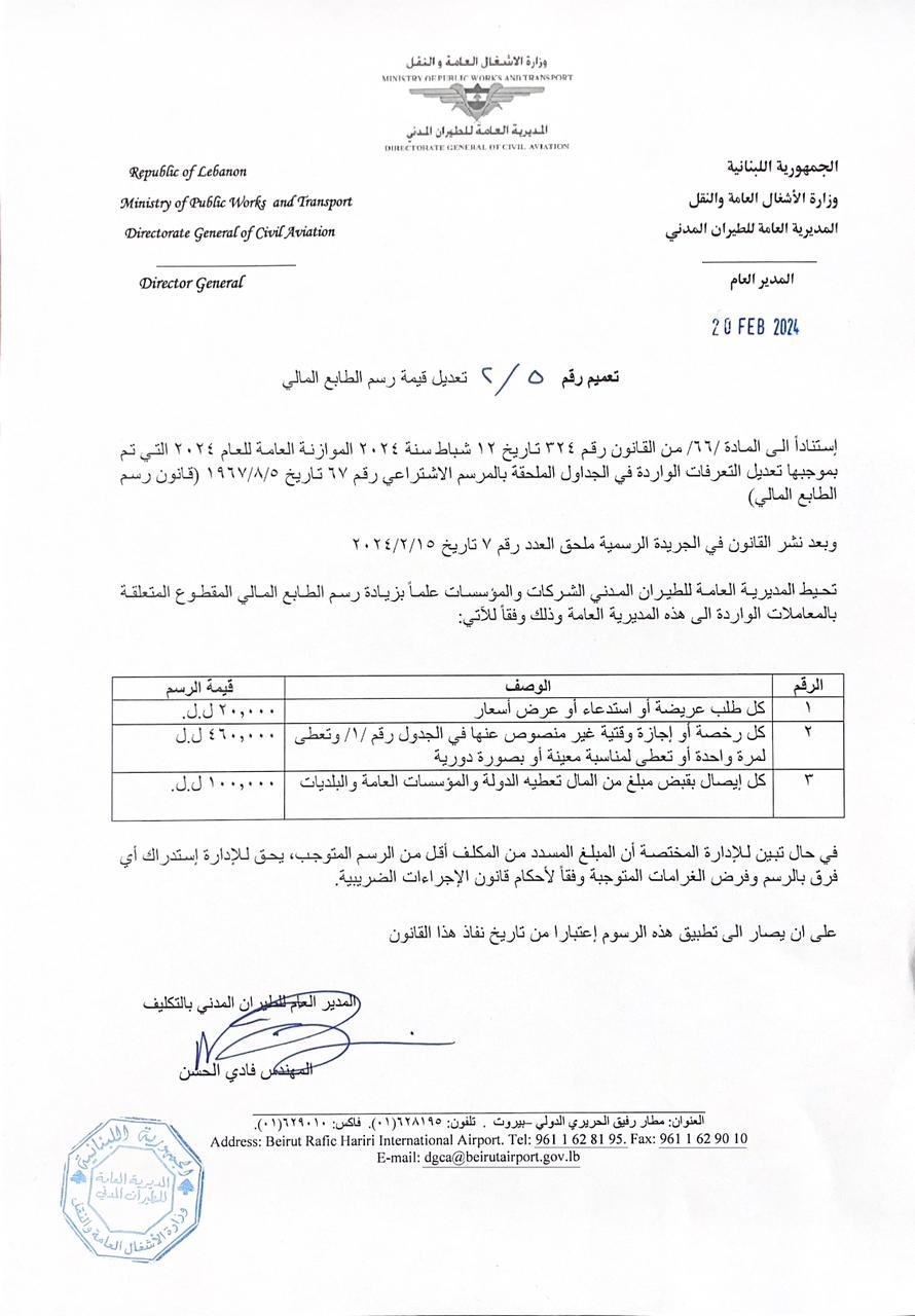 أصدر المدير العام للطيران المدني بالتكليف المهندس فادي الحسن تعميمًا حمل الرقم 2/5 يقضي بتعديل قيمة رسم الطابع المالي.
