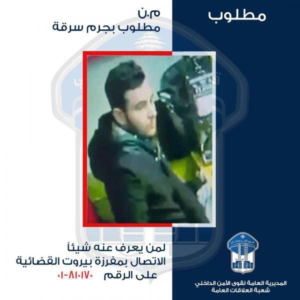 بناءً على إشارة القضاء المختص، تُعمّم المديرية العامة لقوى الأمن الداخلي صورة مطلوب يدعى: (م. ن.) مجهول باقي الهوية، للاشتباه بقيامه بجرائم سرقة.