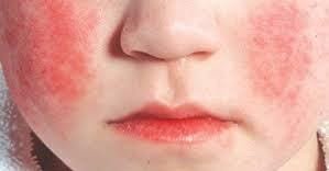 ويتابع:" بعد عدة أيام من بدء الأعراض المبكرة قد يظهر طفح جلدي أحمر وفاتح في بعض الأحيان على وجه الطفل، أبرزها في منطقة الخدّين. وقد يمتد هذا الطفح في نهاية المطاف إلى الذراعين وجذع الجسم والفخذين والردفين، ويكتسب الطفح عندئذ لونًا ورديًا. وقد يثير الطفح الجلدي الشعور بالحكة في الكعبين بوجه خاص.
