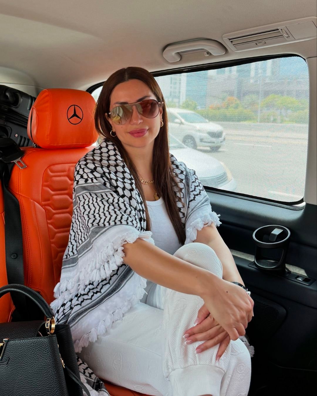 وظهرت نسرين في الصور بلوك كاجوال أبيض بالكامل، نسقت معه الكوفية الفلسطينية.