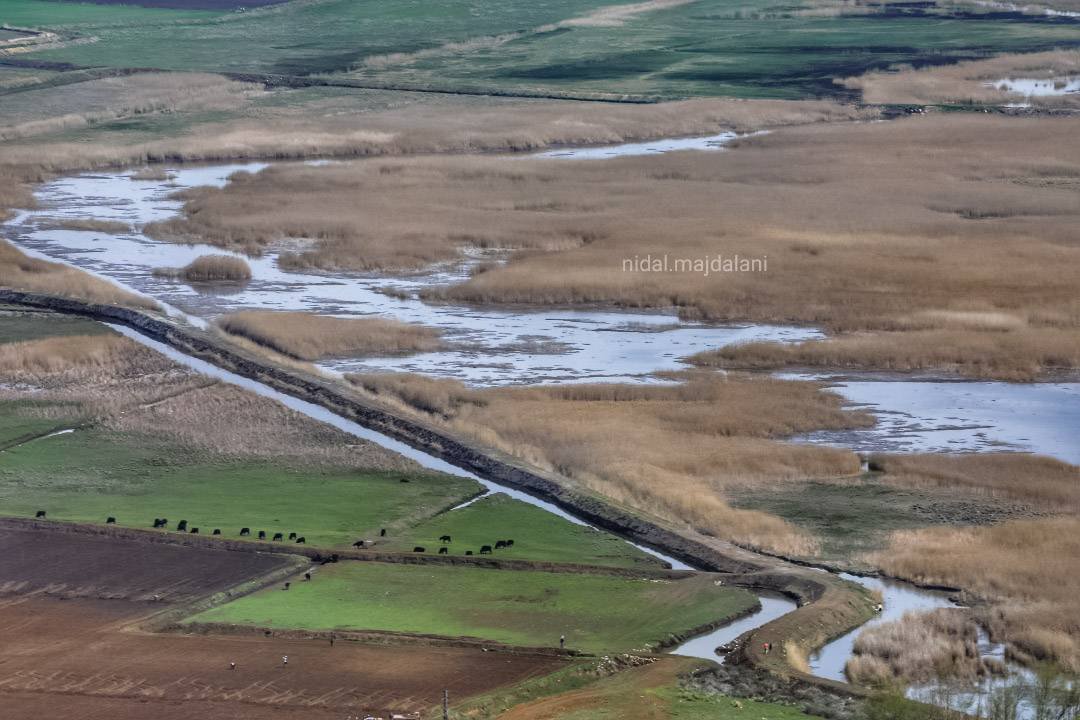 وهنا مجموعة من الجواميس التي ترعى في هذه الأرض وتسبح في مياهها كلما اشتد الحر، وهي ذات علاقة متميزة مع طيور اللقلق.