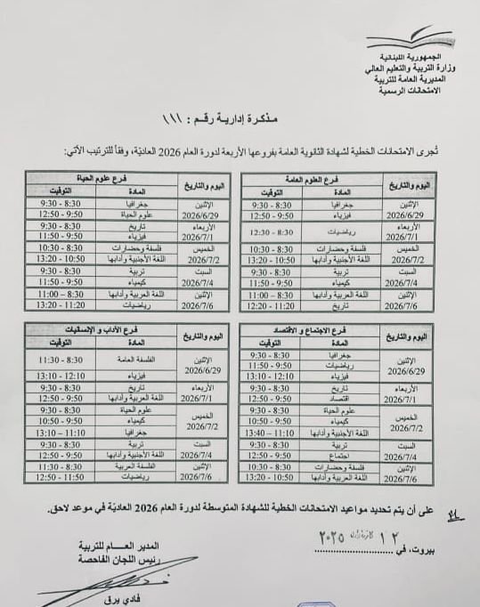 أصدر المدير العام للتربية رئيس اللجان الفاحصة الأستاذ فادي يرق "المذكرة الإدارية رقم: ١١١، المتعلقة بروزنامة إجراء الامتحانات الرسمية لشهادة الثانوية العامة بفروعها الأربعة، على أن تصدر لاحقاً مواعيد إجراء الامتحانات الرسمية للشهادة المتوسطة".